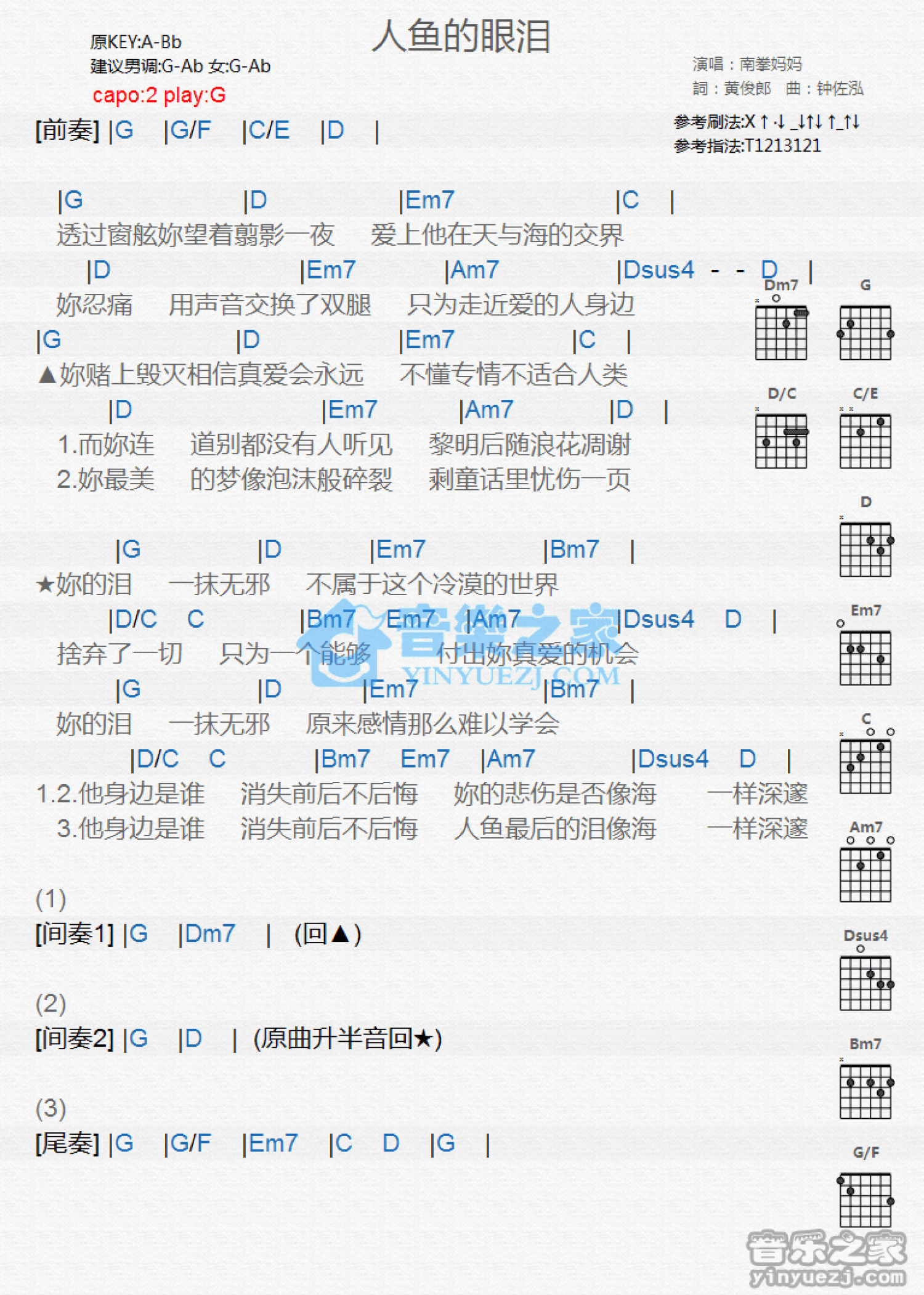 曲谱介绍: G调版南拳妈妈《人鱼的眼泪》吉他和弦弹唱谱