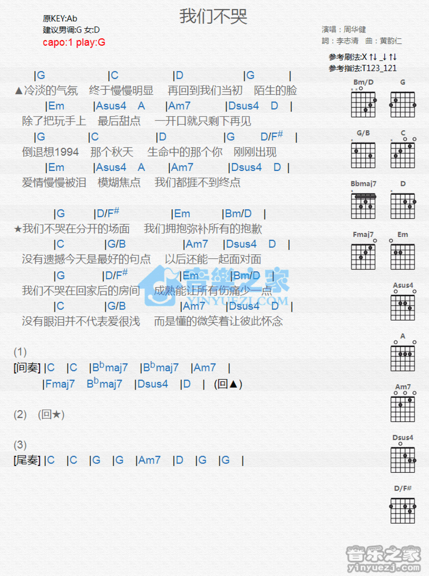 曲谱介绍: G调版周华健《我们不哭》吉他和弦弹唱谱