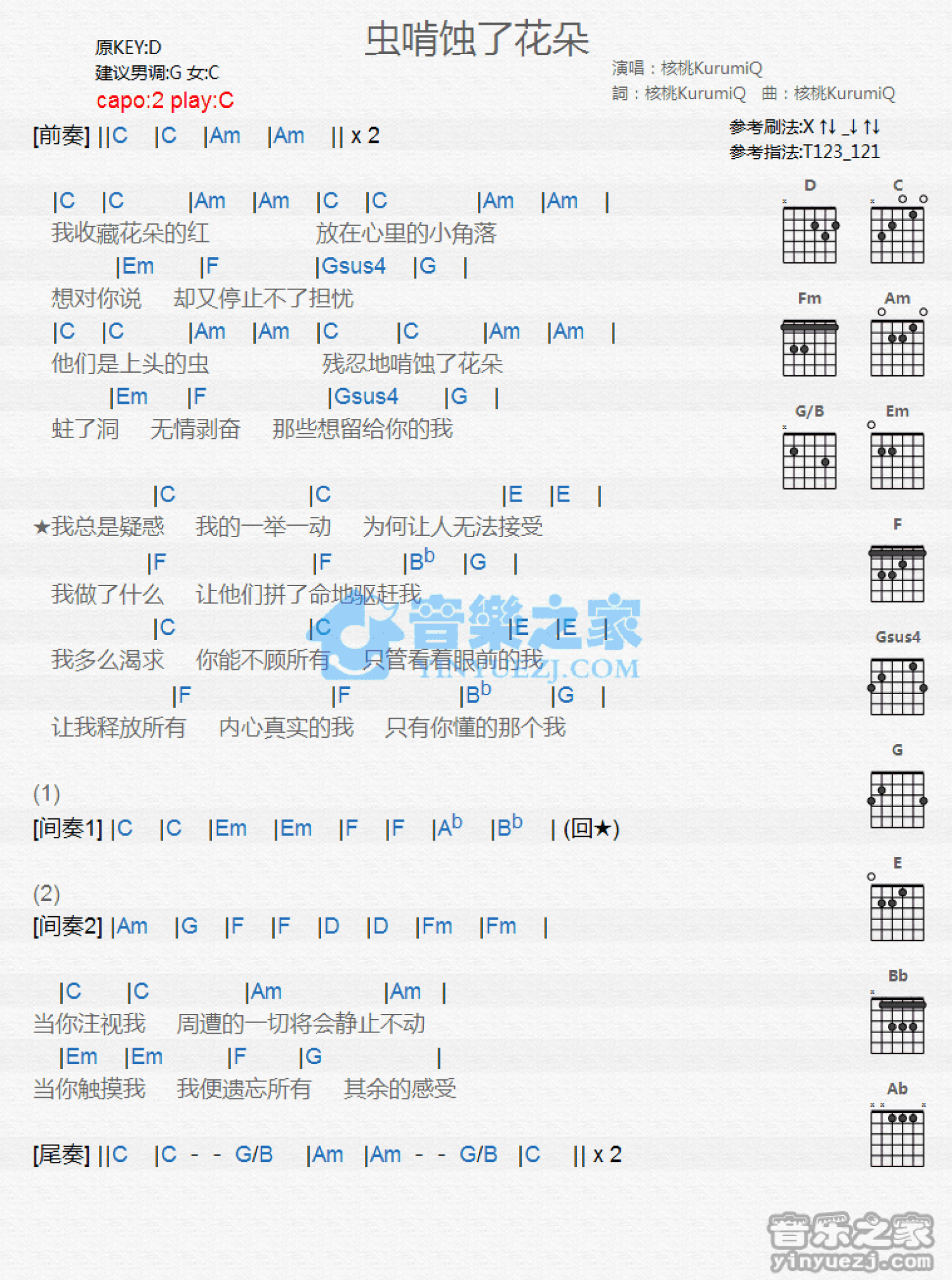 虫啃食了花朵吉他谱 - 核桃KurumiQ - C调吉他弹唱谱 - 和弦谱