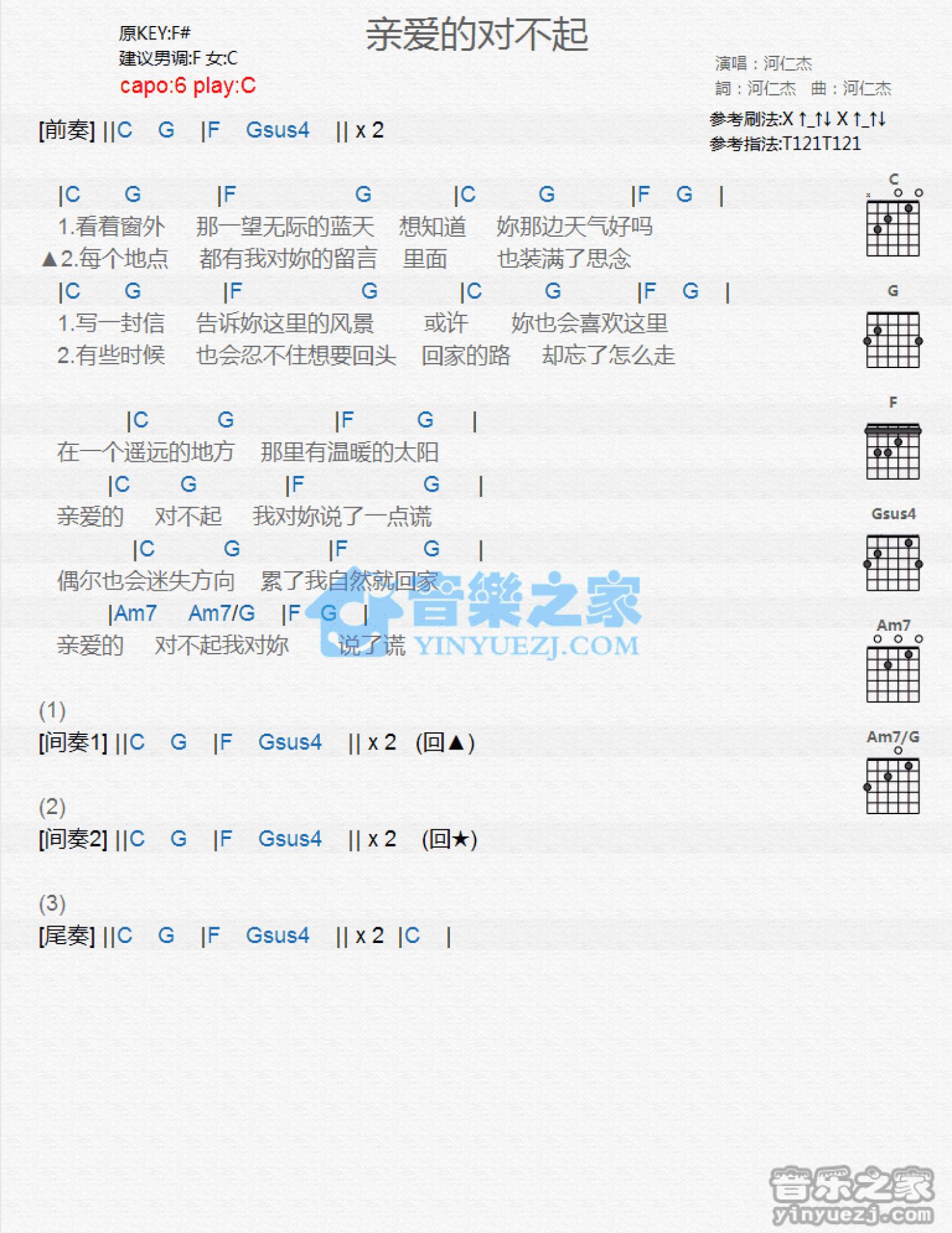 曲谱介绍: C调版河仁杰《亲爱的对不起》吉他和弦弹唱谱