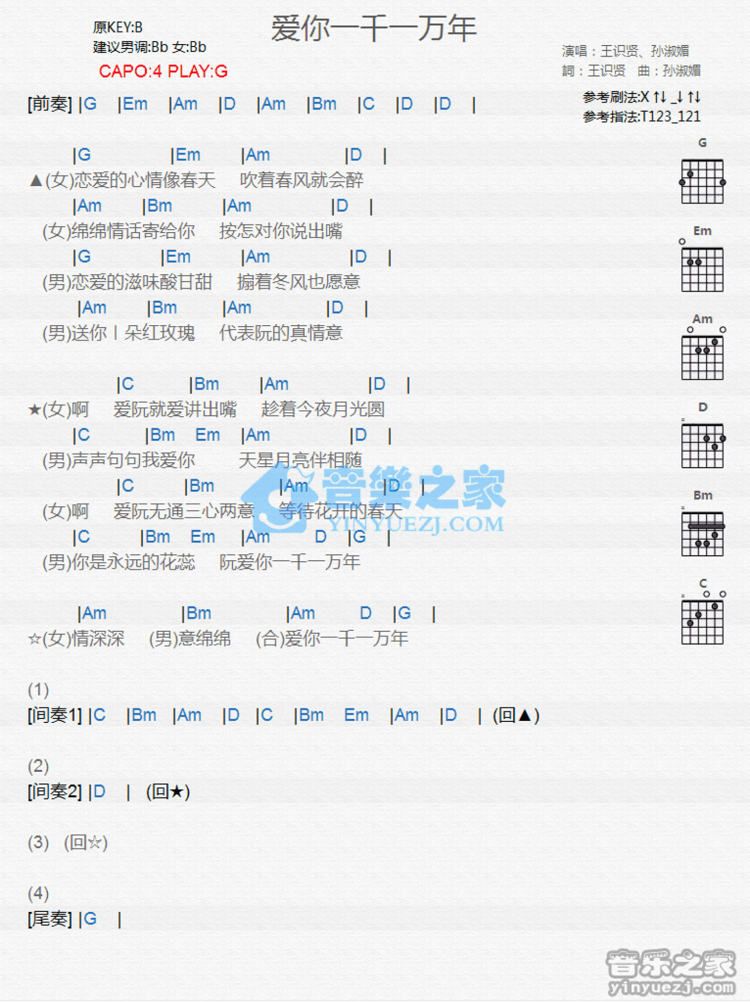 曲谱介绍: G调版王识贤/孙淑媚《爱你一千一万年》吉他和弦弹唱谱
