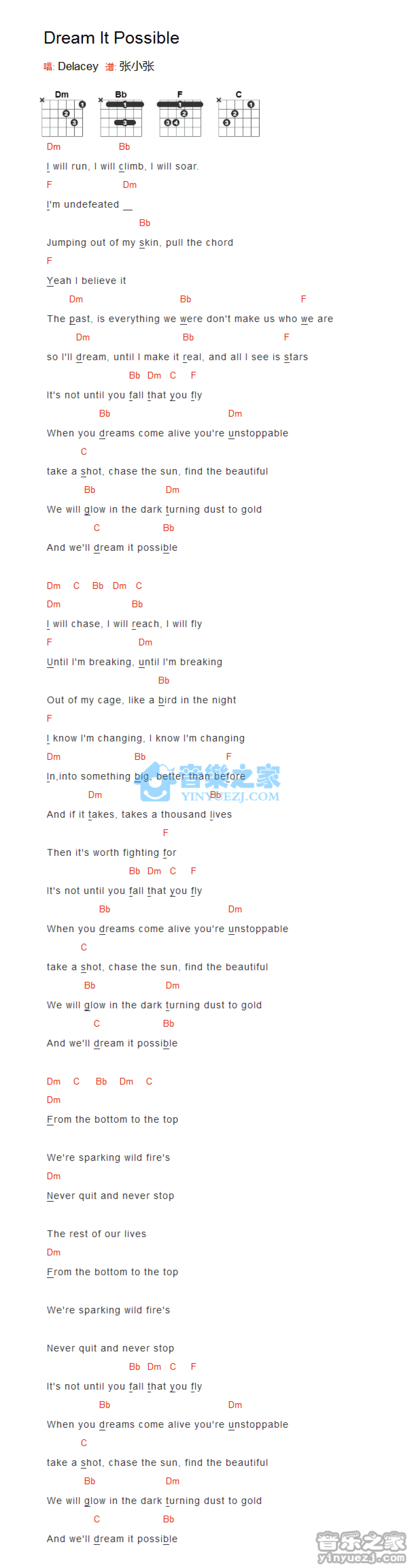 曲谱介绍: Delacey《DreamItPossible》吉他和弦弹唱谱