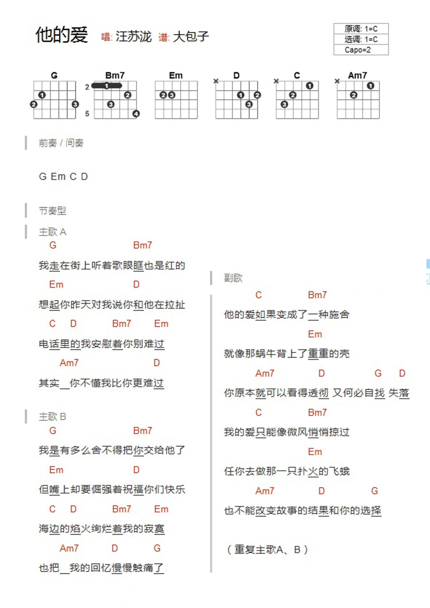 曲谱介绍: C调版汪苏泷《他的爱》吉他和弦弹唱谱
