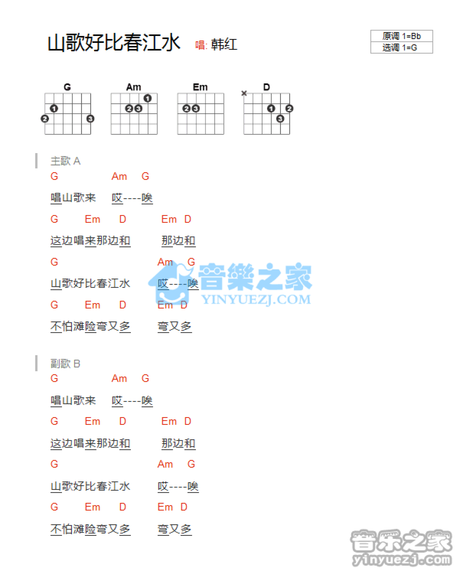 曲谱介绍: G调版韩红《山歌好比春江水》吉他和弦弹唱谱