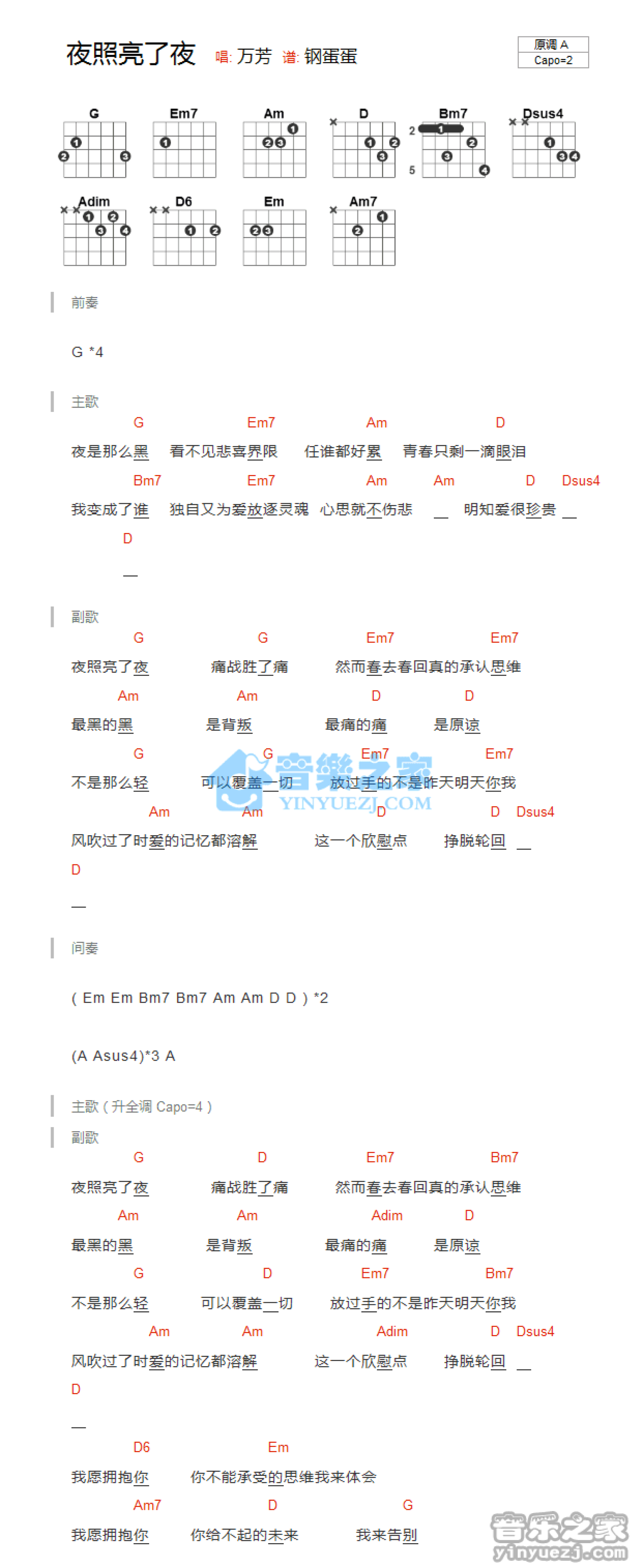 曲谱介绍: A调版万芳《夜照亮了夜》吉他和弦弹唱谱