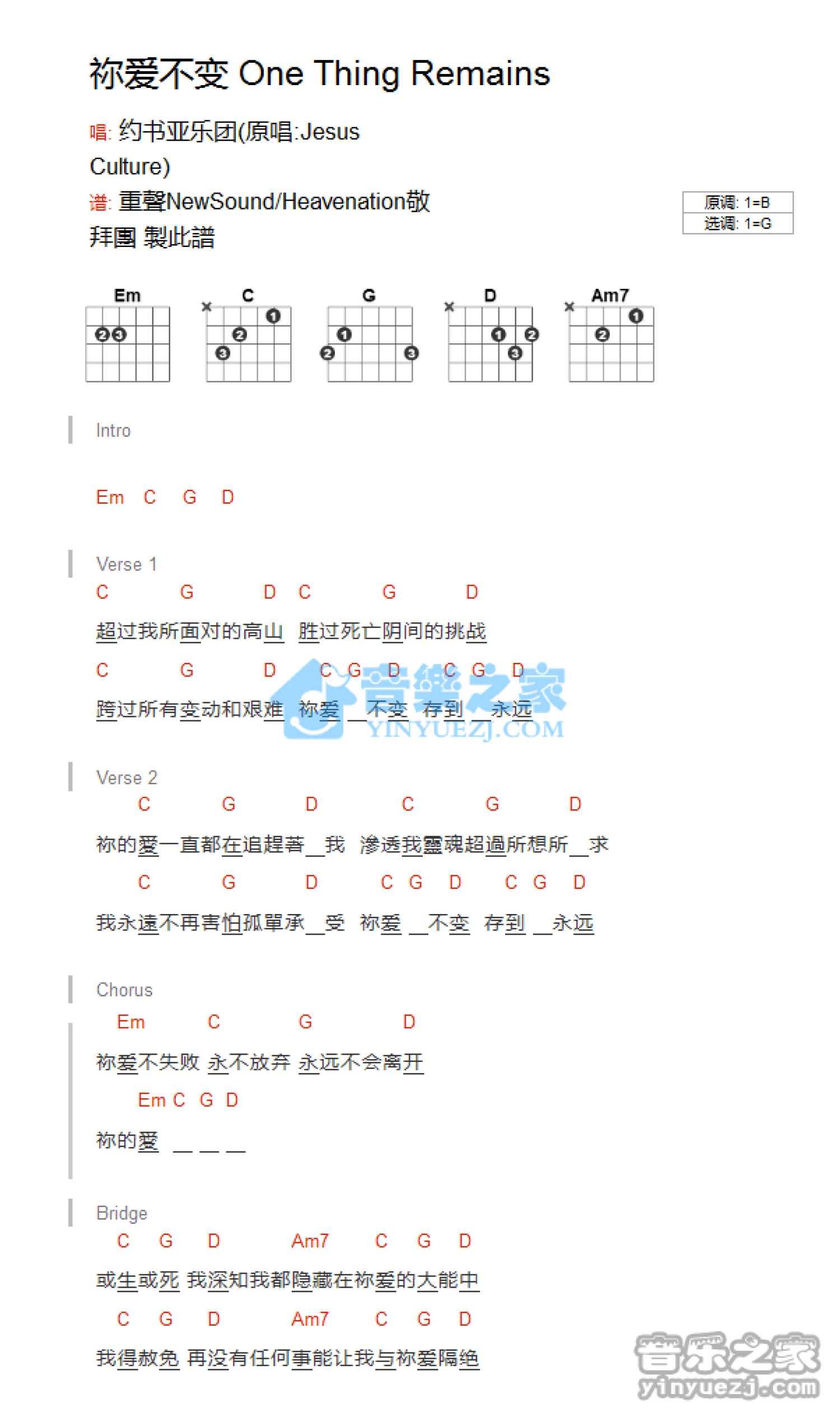 曲谱介绍: G调版约书亚《你爱不变》吉他和弦弹唱谱