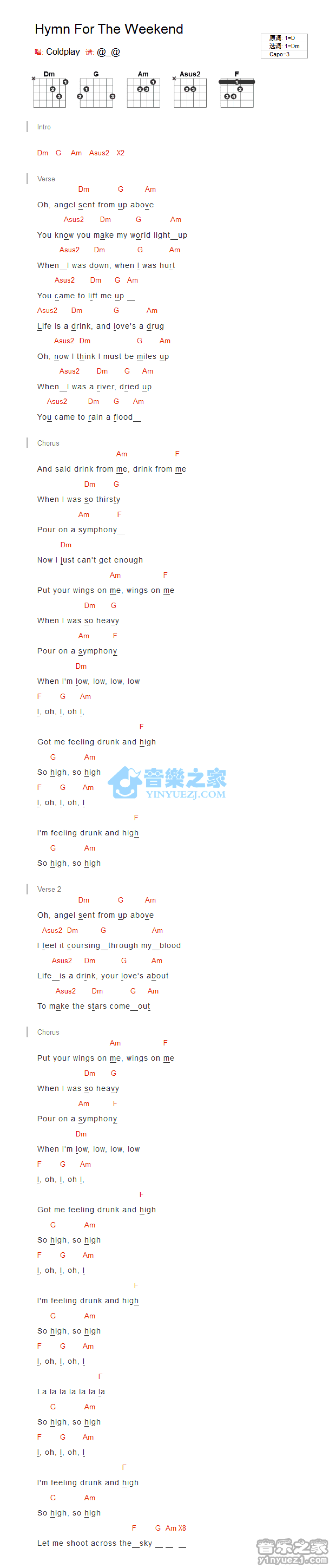 曲谱介绍: Dm调版Coldplay《HymnForTheWeekend》吉他和弦弹唱谱