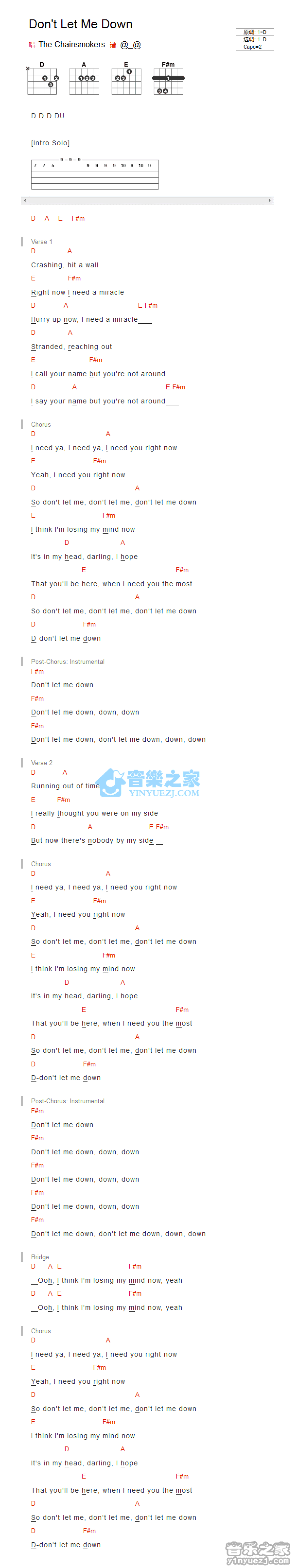 Don't Let Me Down吉他谱 - The Chainsmokers - D调吉他弹唱谱 - 和弦谱