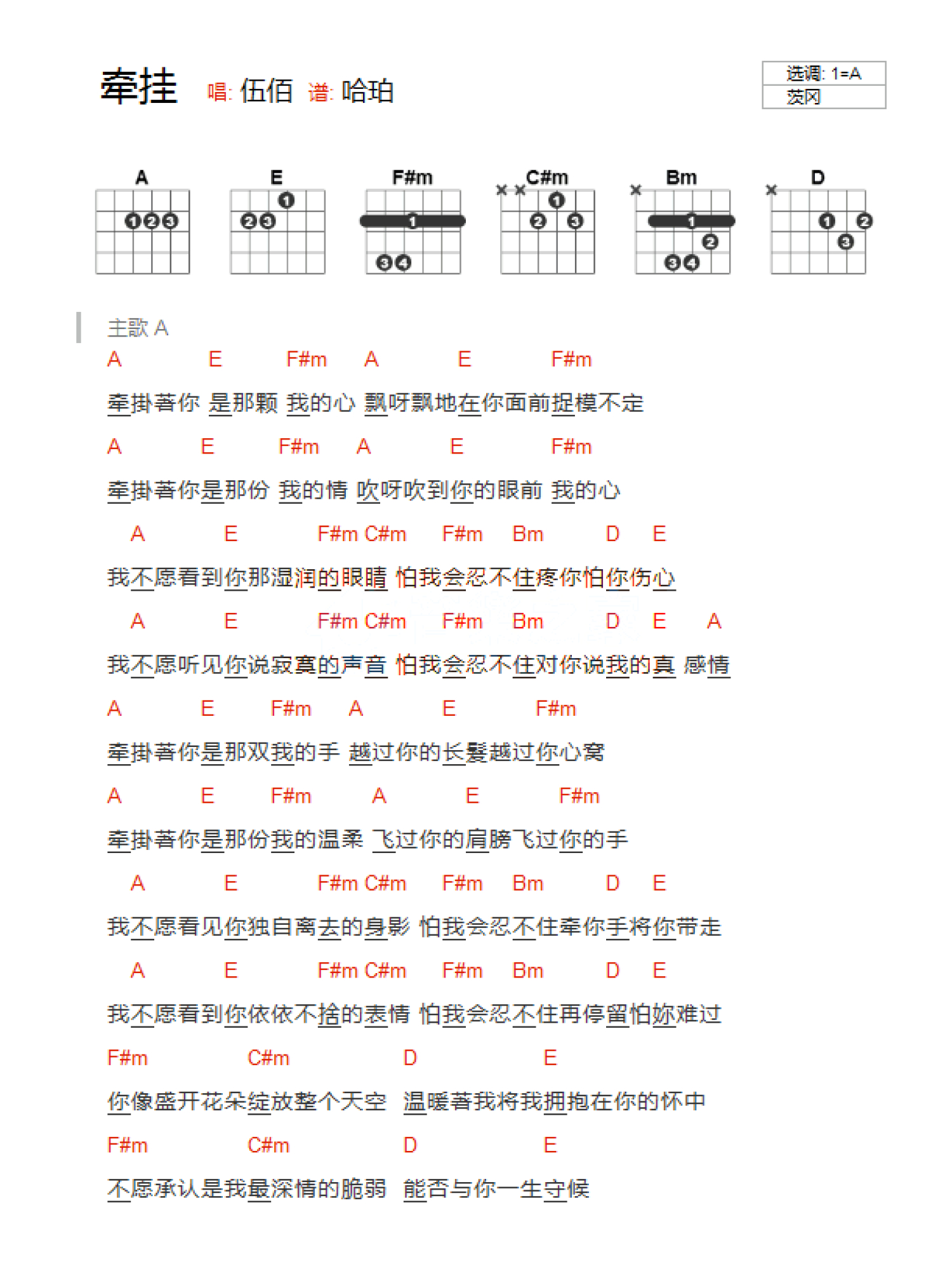 曲谱介绍: A调版《牵挂》吉他和弦弹唱谱