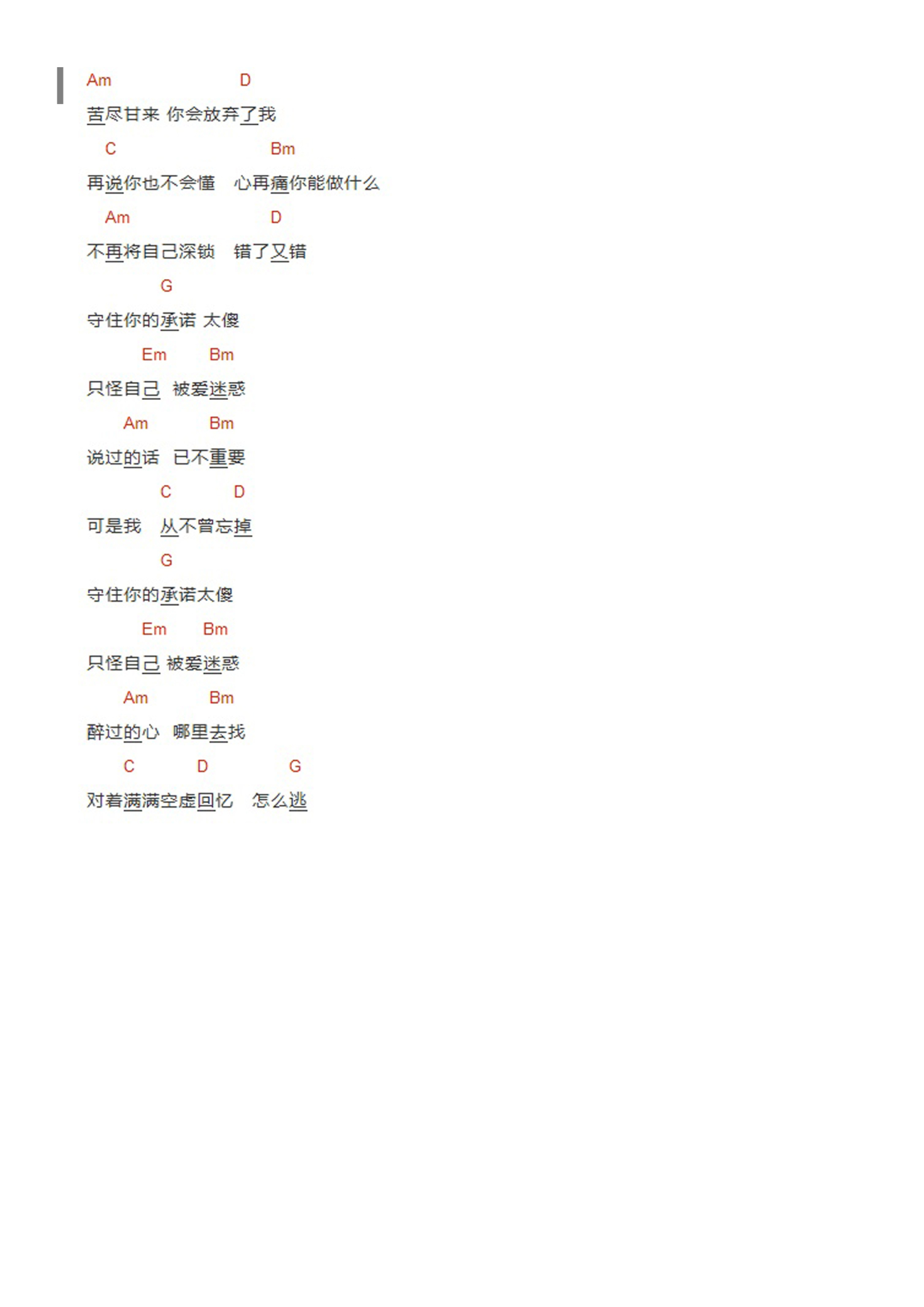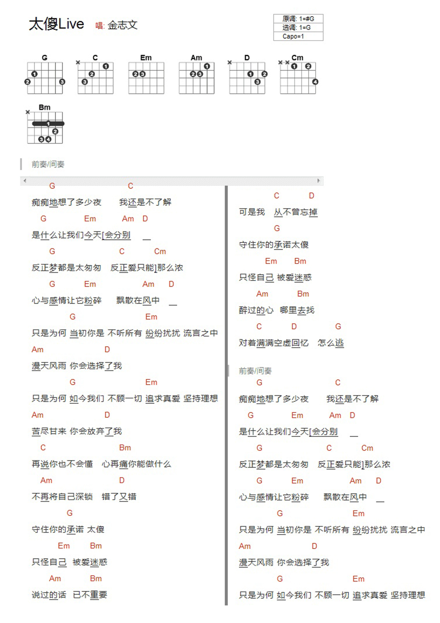 曲谱介绍: G调版《太傻》吉他和弦弹唱谱