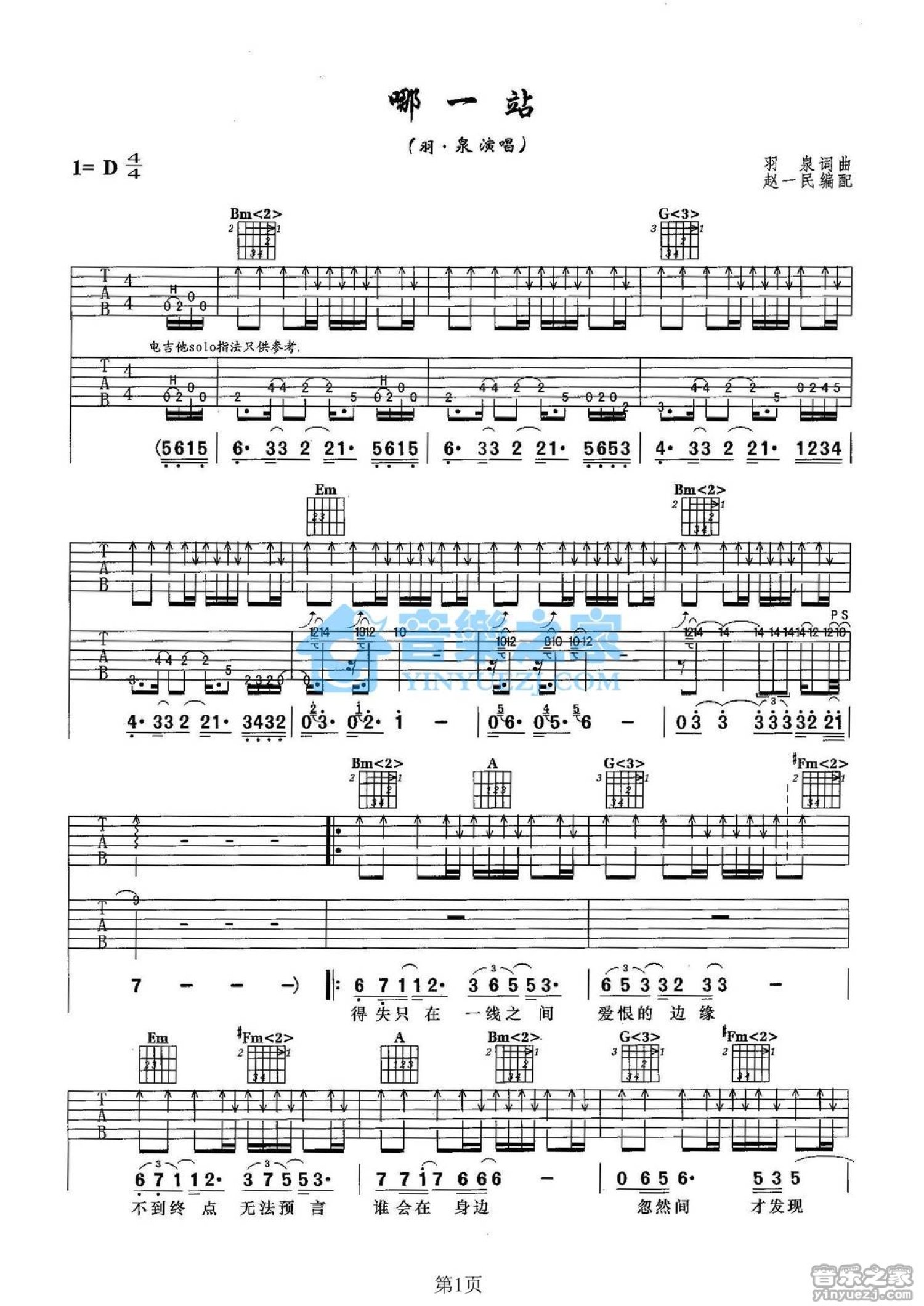 曲谱介绍: D调双吉他版羽泉《哪一站》吉他弹唱六线谱