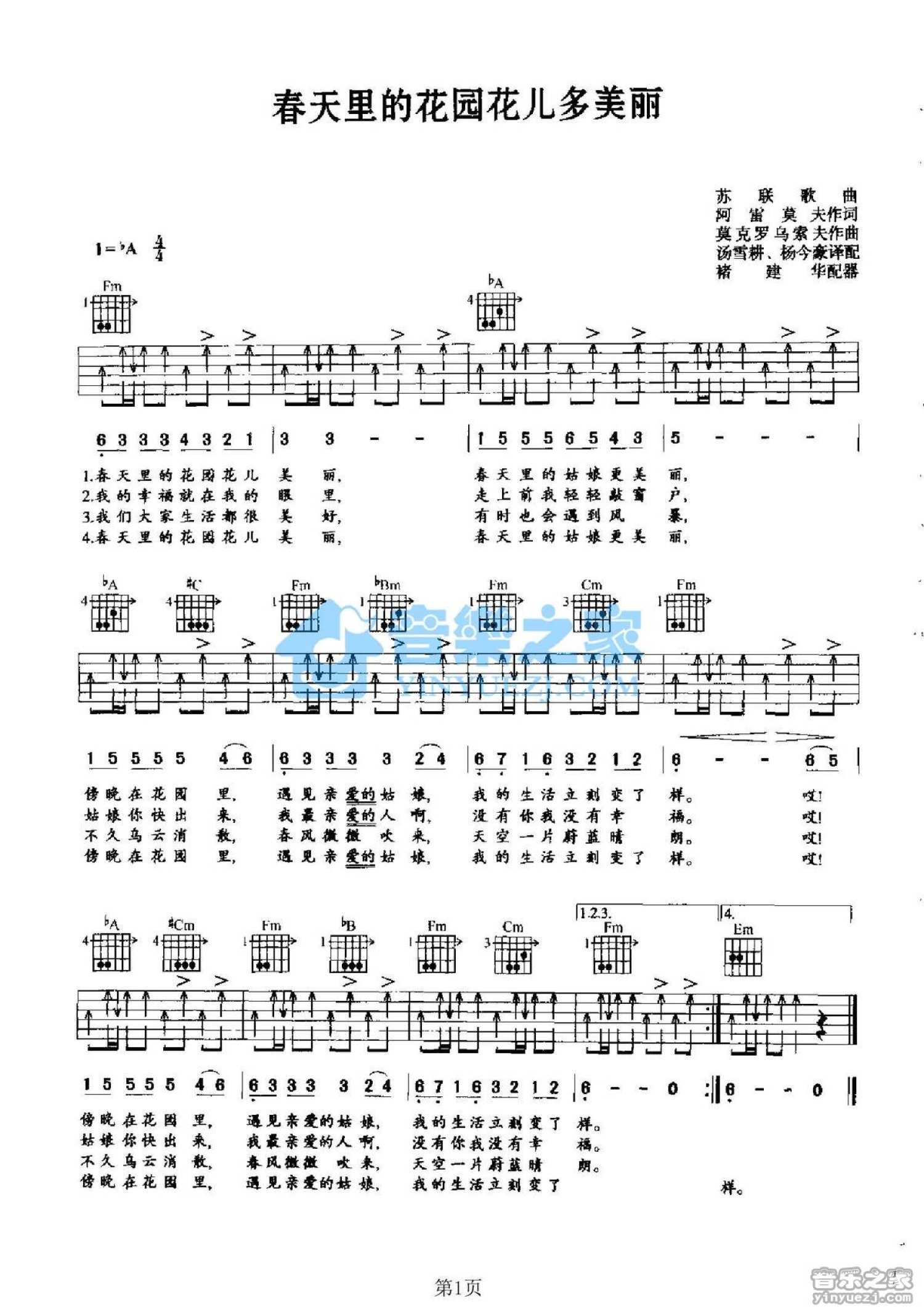 曲谱介绍: bA调版《春天里的花园花儿多美丽》吉他弹唱六线谱