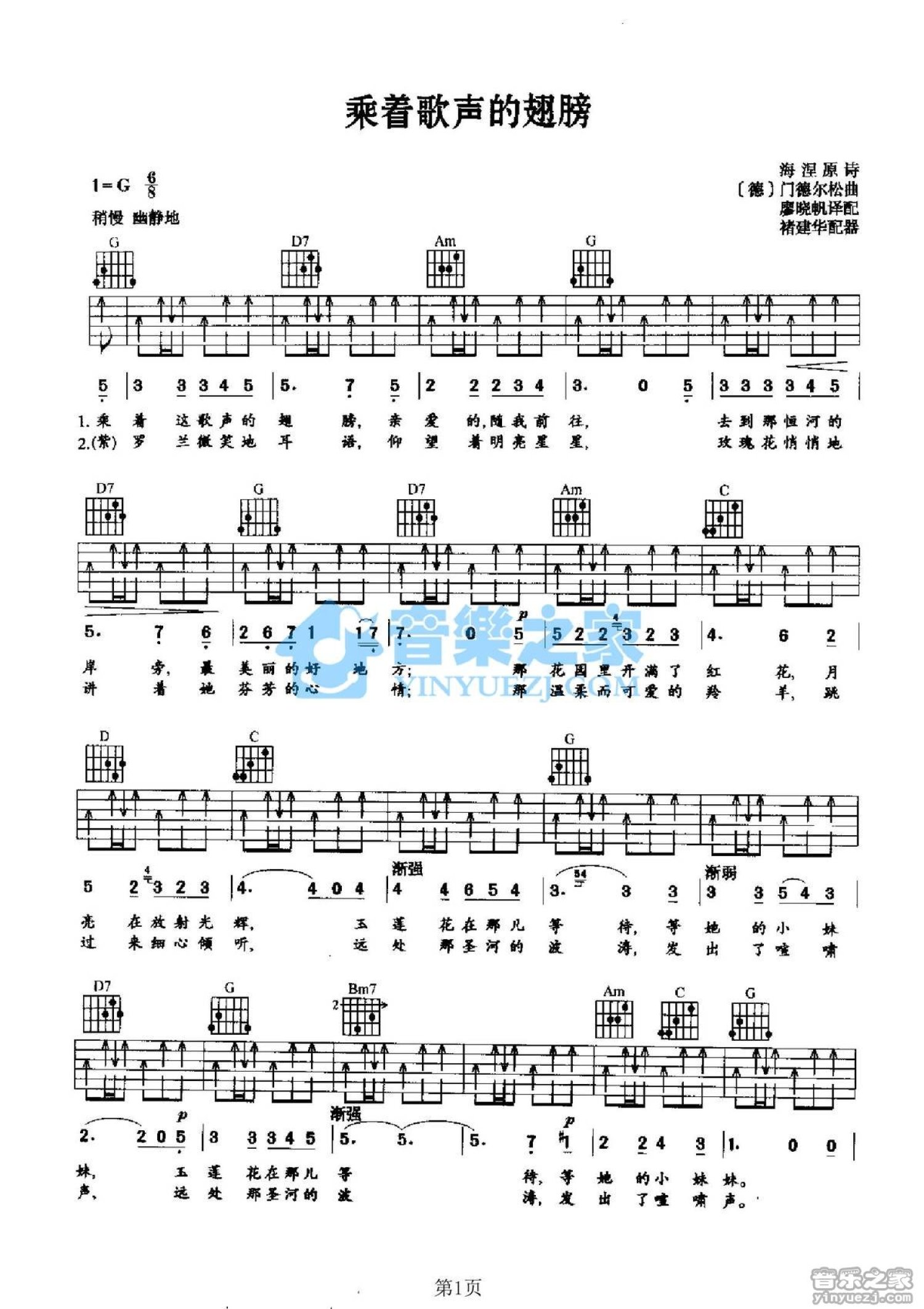 曲谱介绍: G调版门德尔松《乘着歌声的翅膀》吉他弹唱六线谱