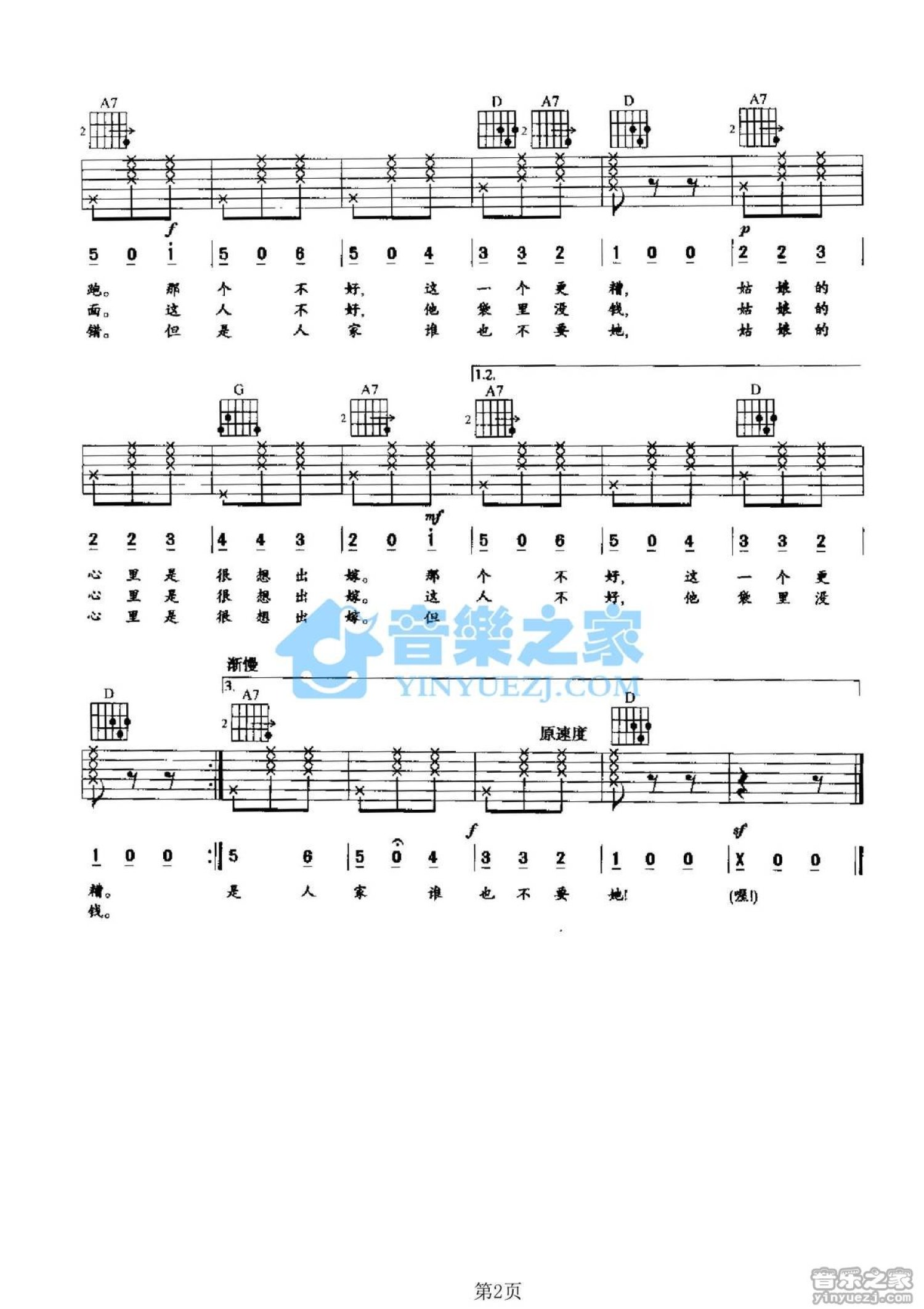 曲谱介绍: D调版捷克民歌《爱挑剔的大姑娘》吉他弹唱六线谱