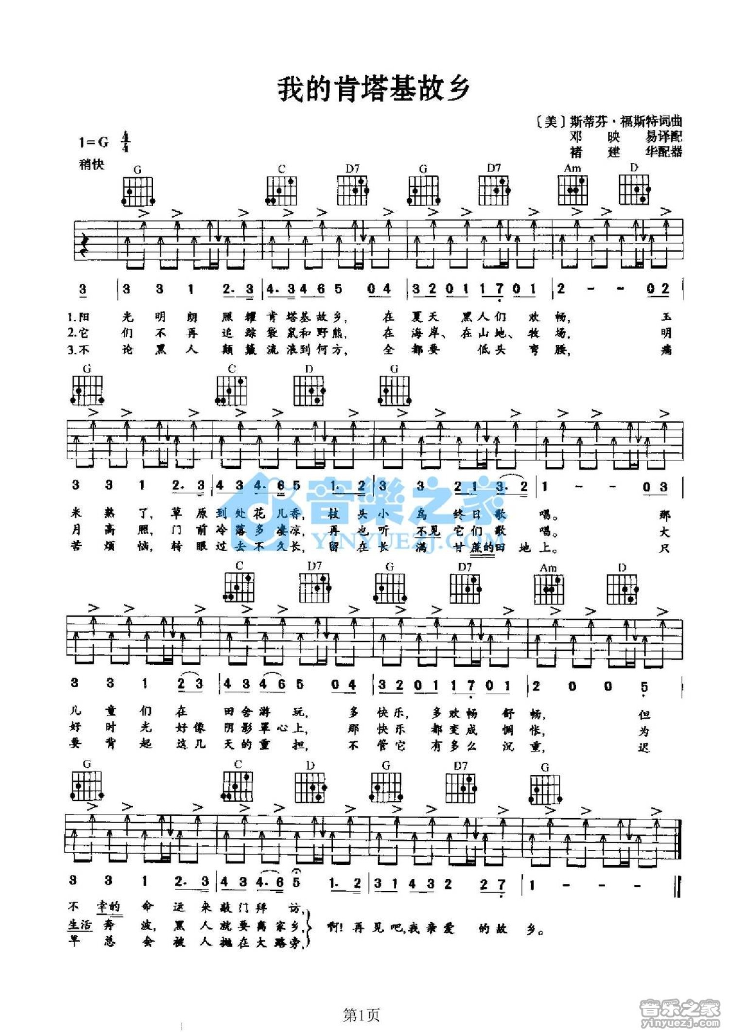 曲谱介绍: G调版美国歌曲《我的肯塔基故乡》吉他弹唱六线谱