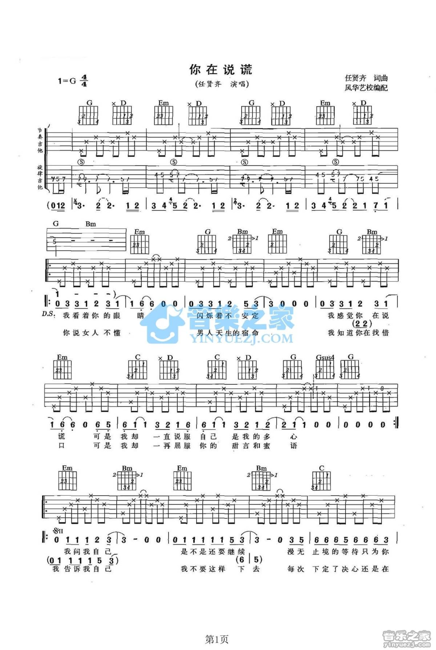 曲谱介绍: G调双吉他版任贤齐《你在说谎》吉他弹唱六线谱