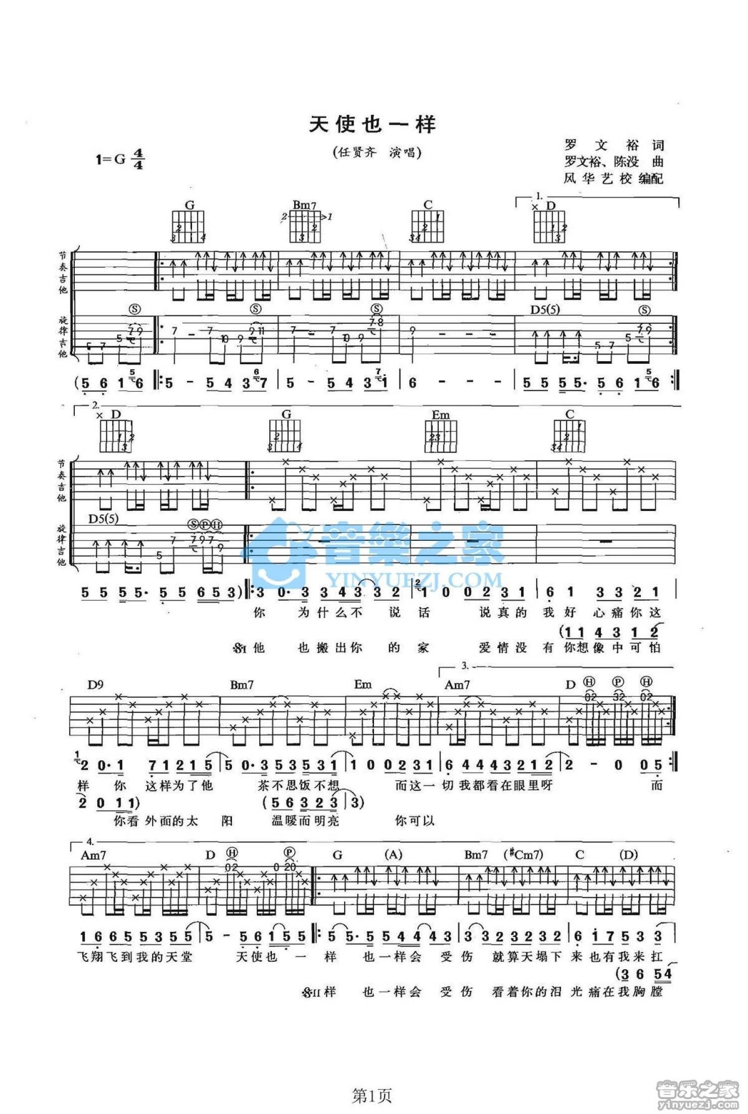 天使也一样吉他谱 - 任贤齐 - G调吉他弹唱谱 - 双吉他版