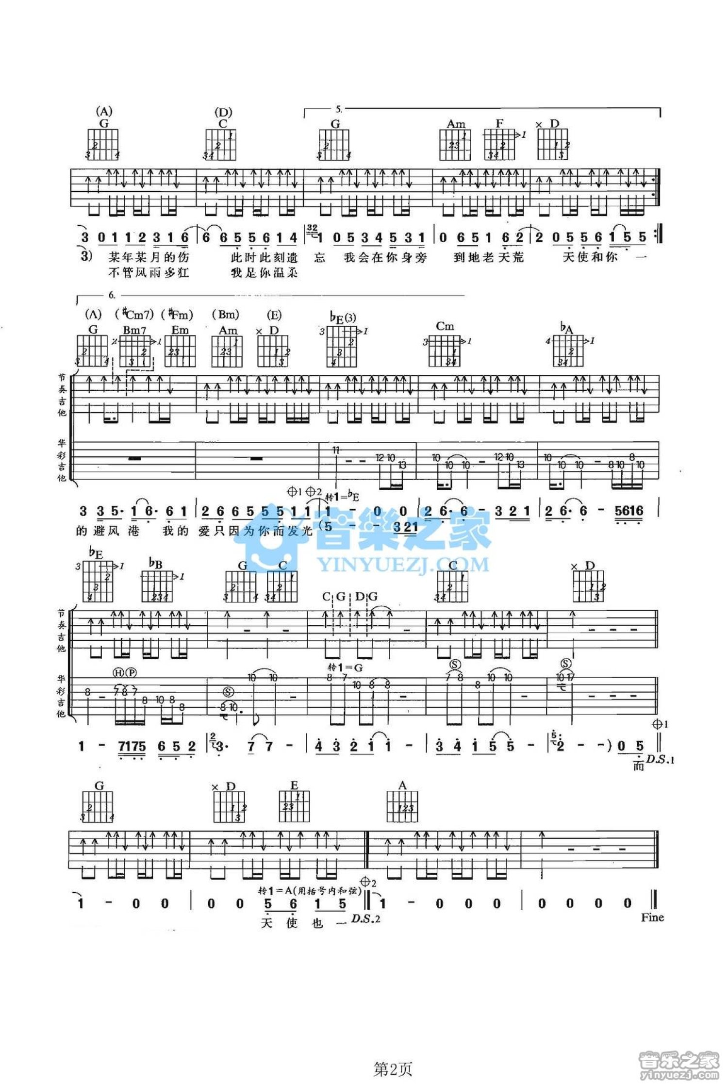 曲谱介绍: G调双吉他版任贤齐《天使也一样》吉他弹唱六线谱