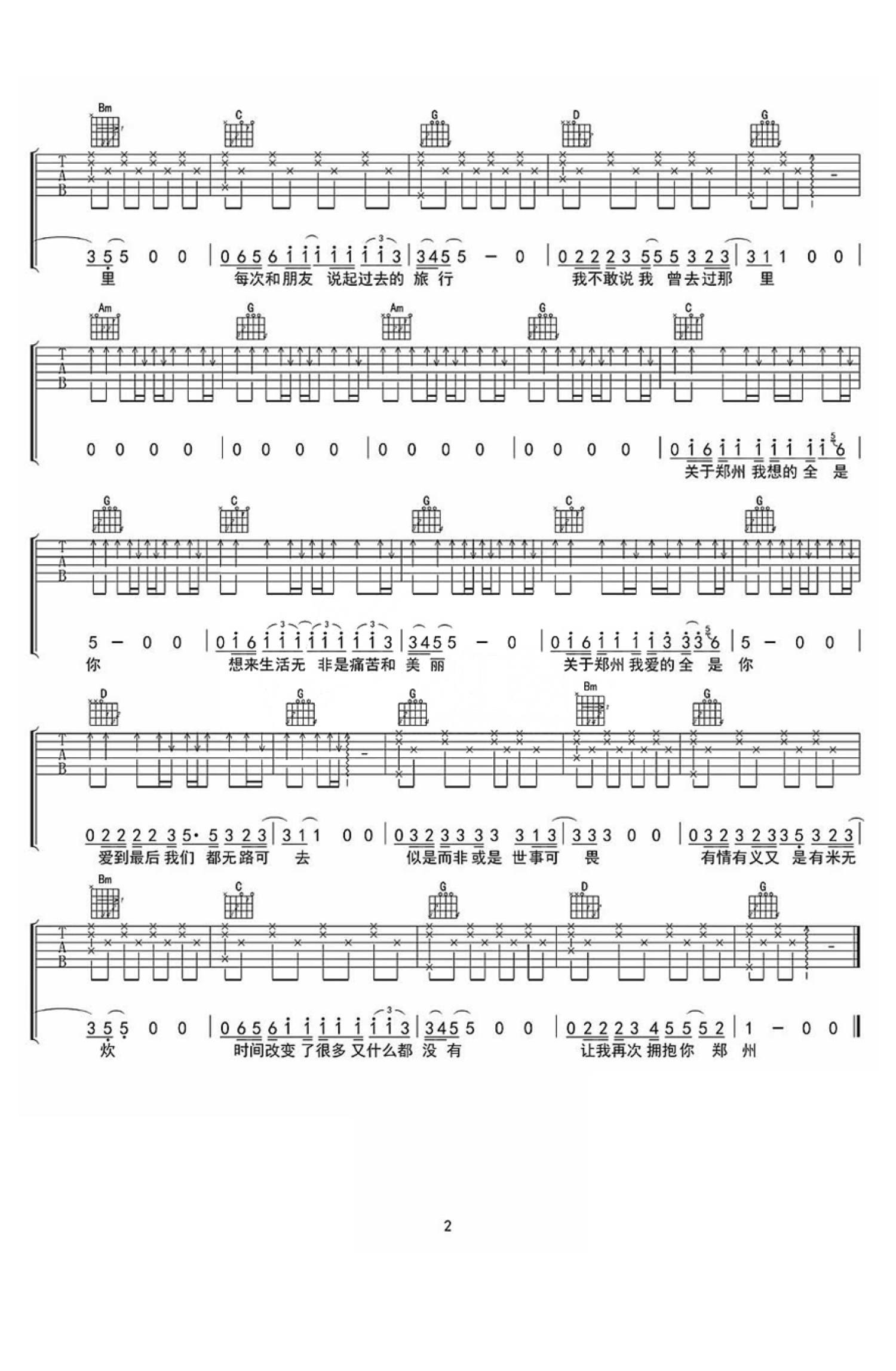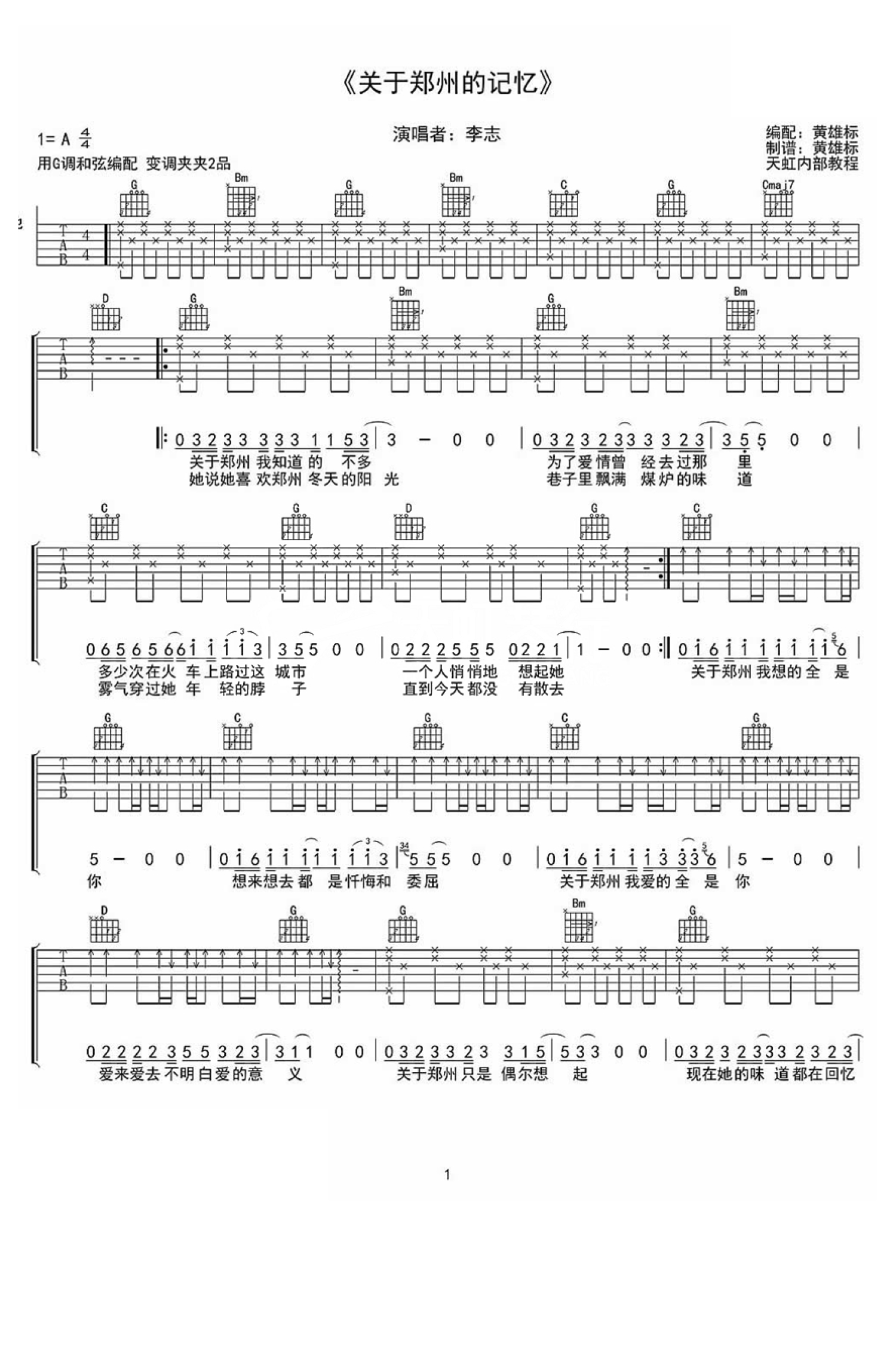 曲谱介绍: 原调A,用G调和弦编配,变调夹夹第二品。曲谱为天虹内部吉他教程,感谢黄雄标编配制谱。民谣诗人李志的《关于郑州的记忆》,舒服的旋律,也许你在他的故事里看到你的故事。有时候低声吟唱比撕心裂肺吼叫更打动人心,朴实的歌词简单的旋律,娓娓道来自己关于郑州的记忆,一首歌似乎让郑州变的浪漫,每个人心里都有一个城市的记忆。