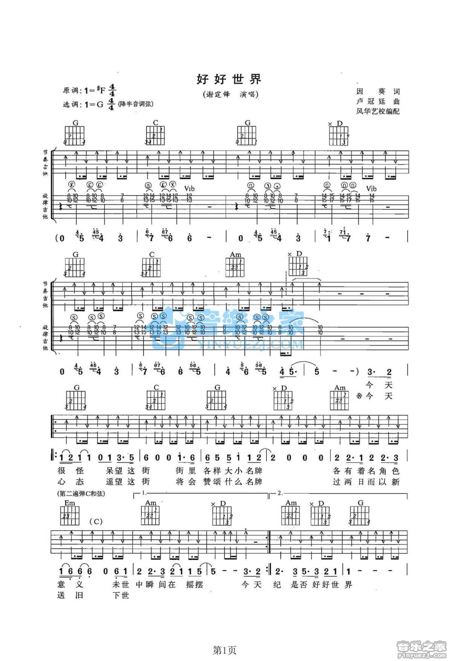 曲谱介绍: G调双吉他版谢霆锋《好好世界》吉他弹唱六线谱