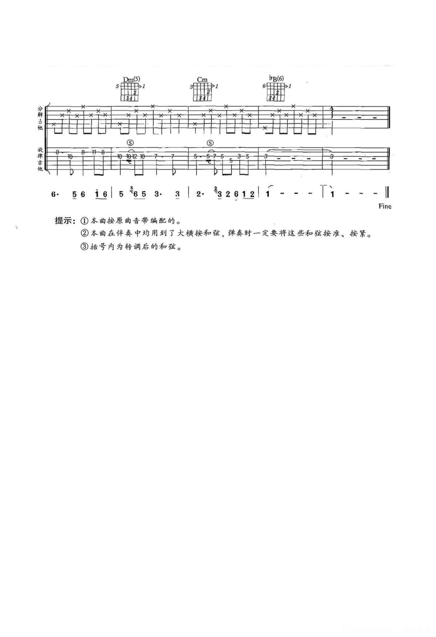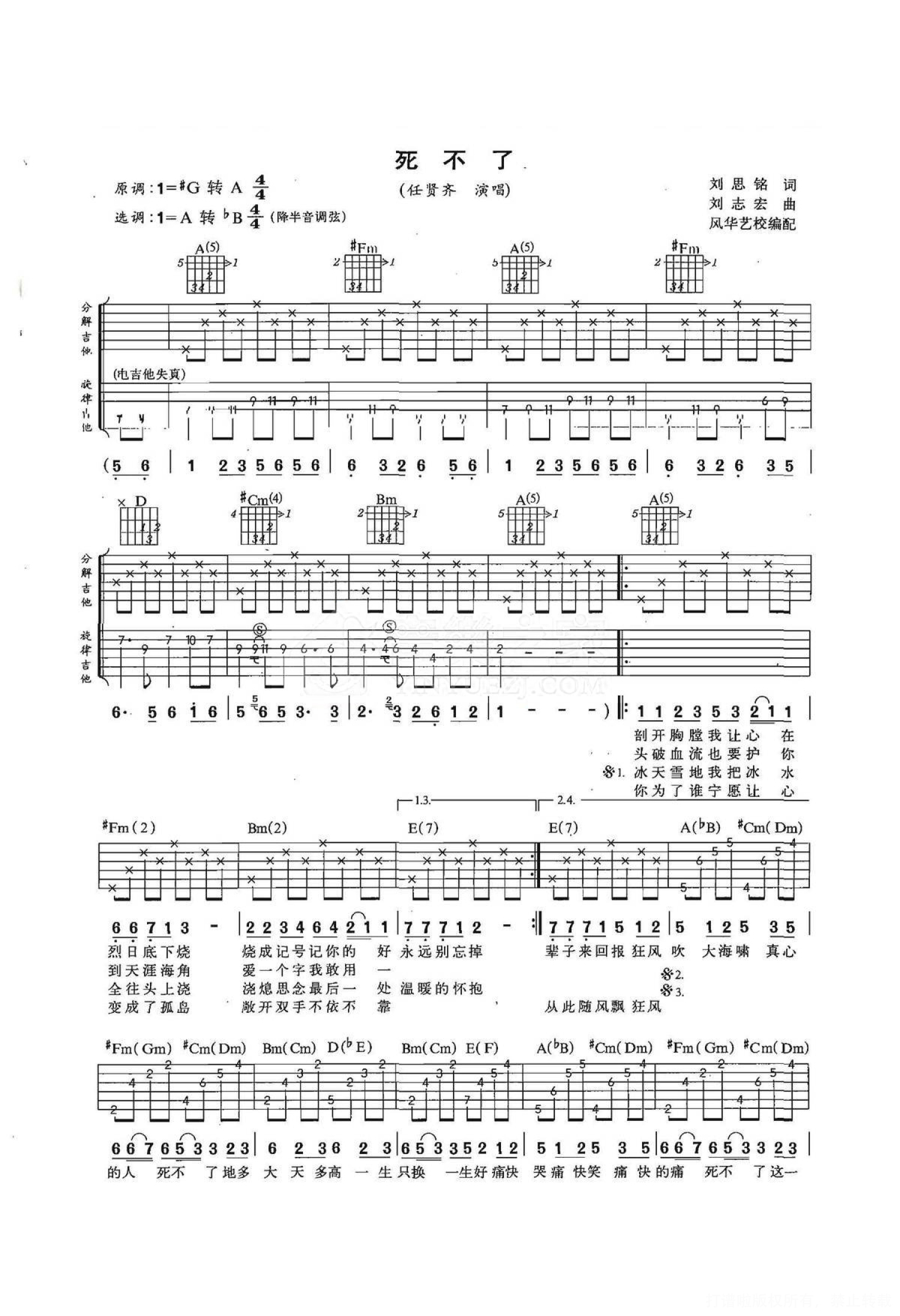 曲谱介绍: A转bB调双吉他版任贤齐《死不了》吉他弹唱六线谱
