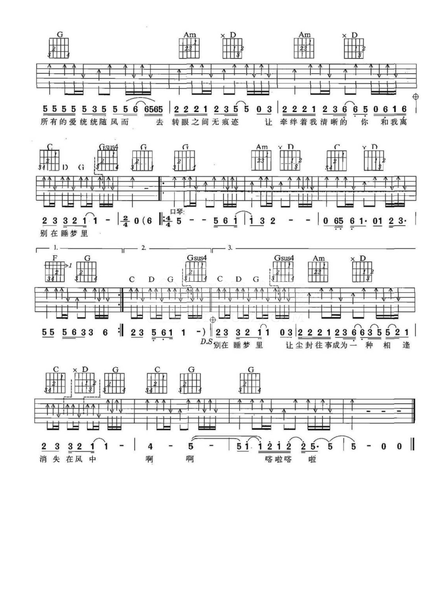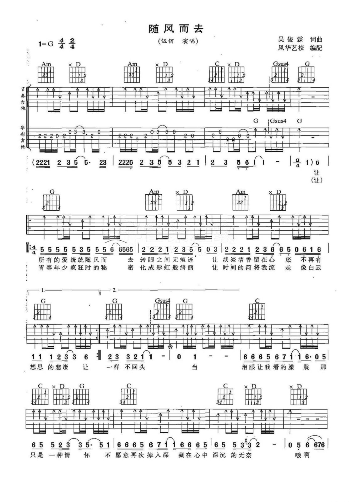 曲谱介绍: G调双吉他版伍佰《随风而去》吉他弹唱六线谱