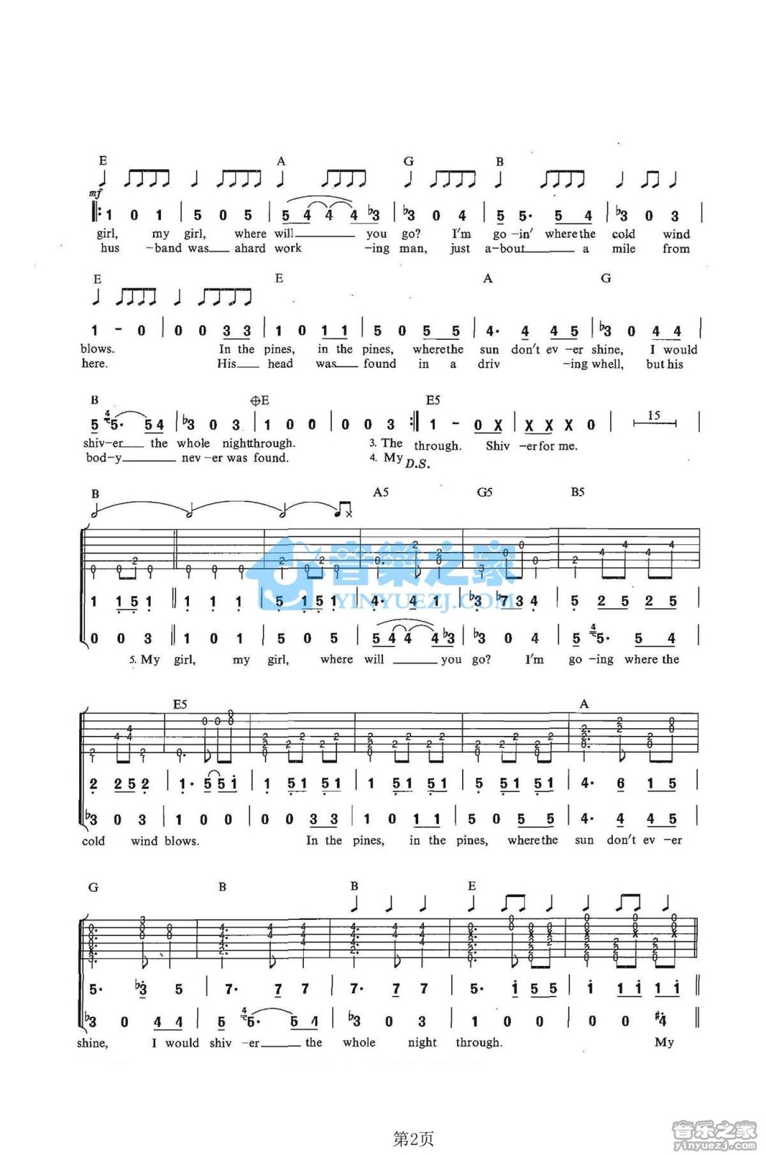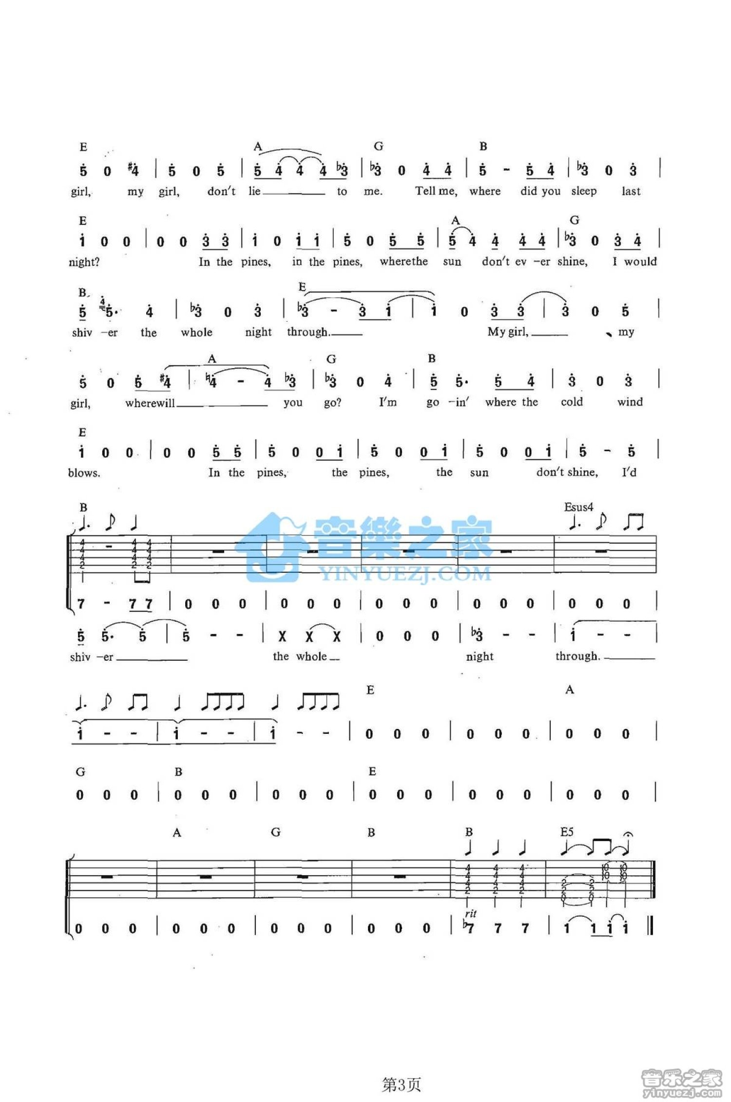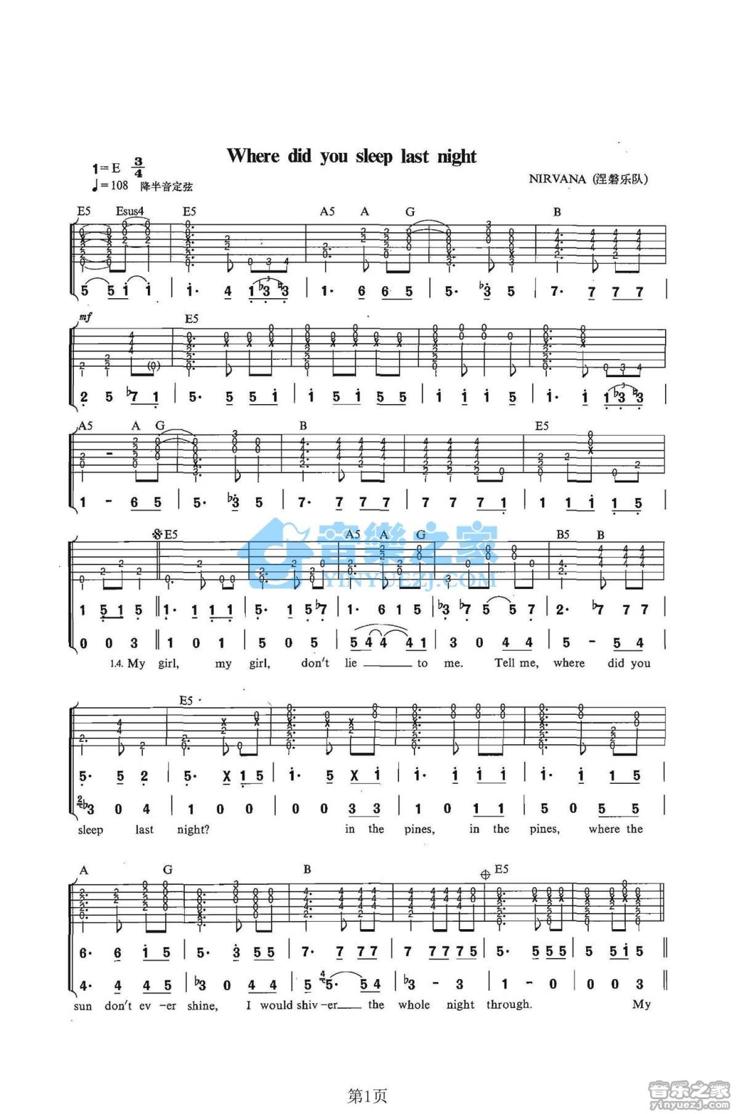 曲谱介绍: E调《WhereDidYouSleepTonight》吉他弹唱六线谱