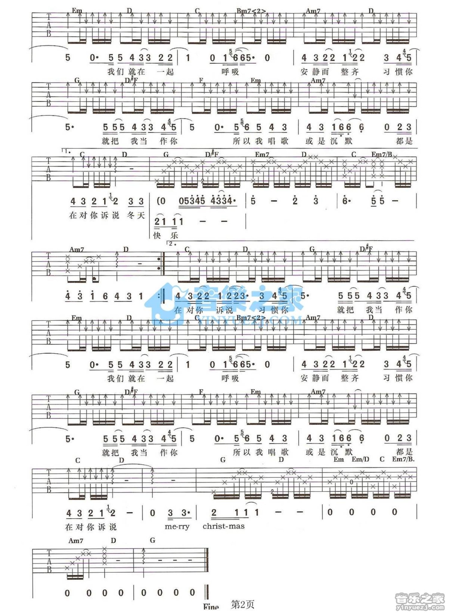曲谱介绍: G调版《冬天快乐》吉他弹唱六线谱
