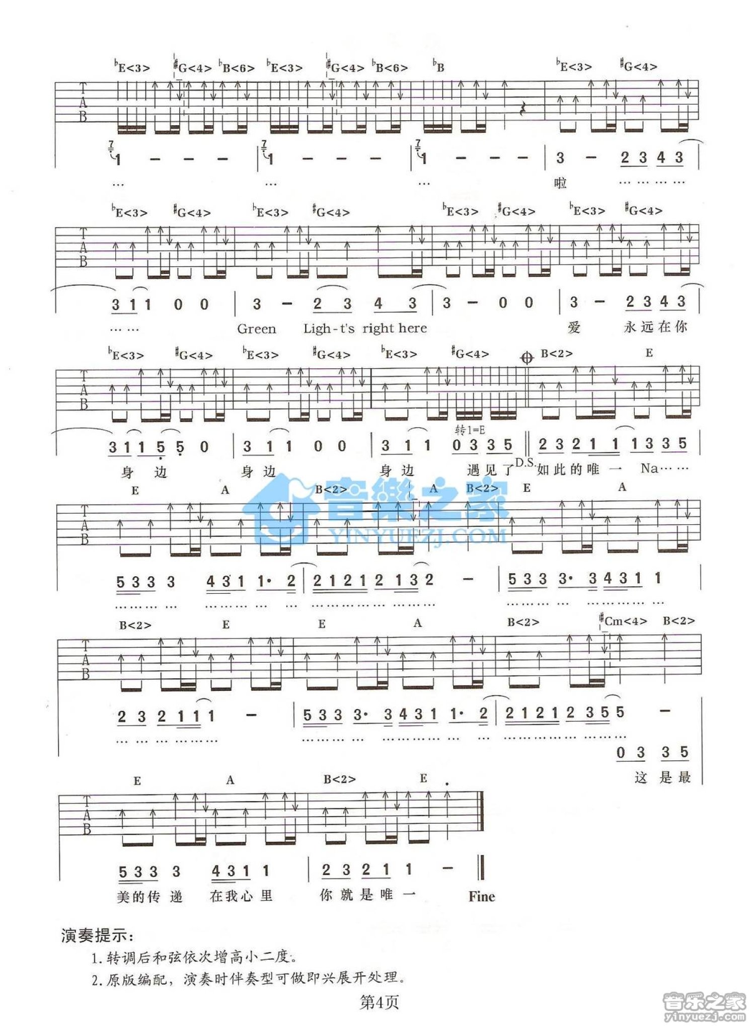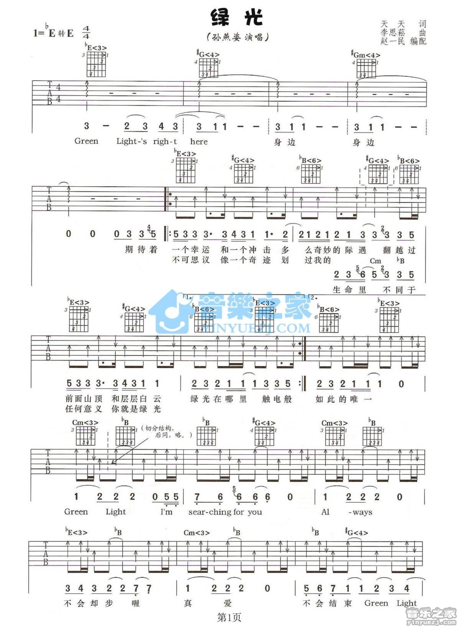 曲谱介绍: bE转E调版《绿光》吉他弹唱六线谱
