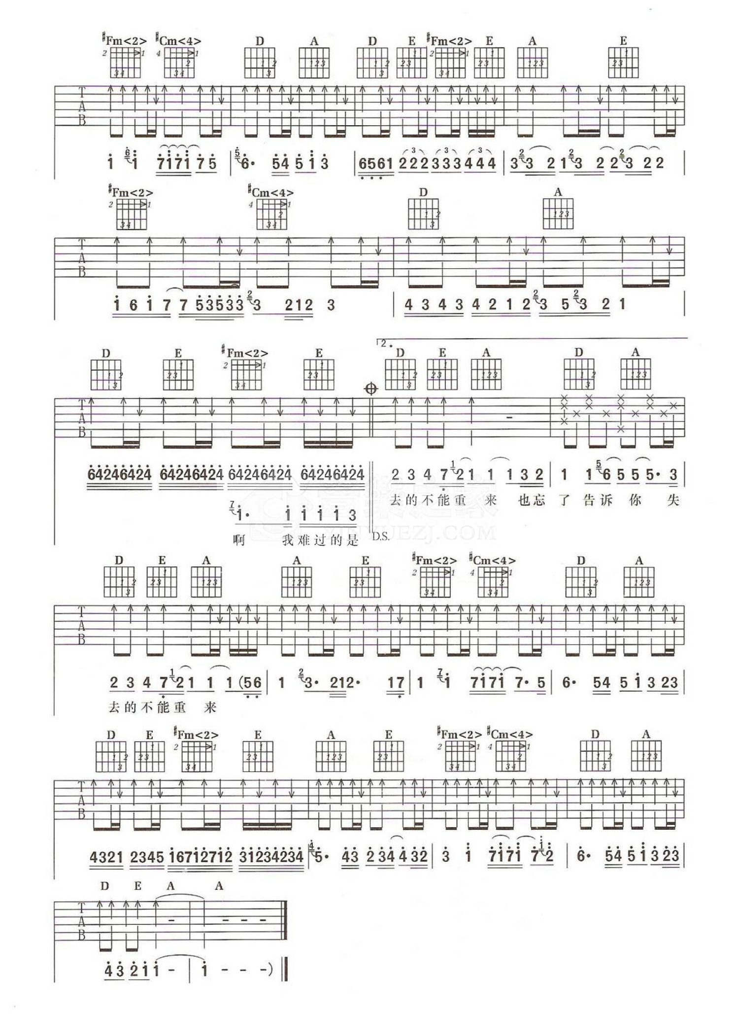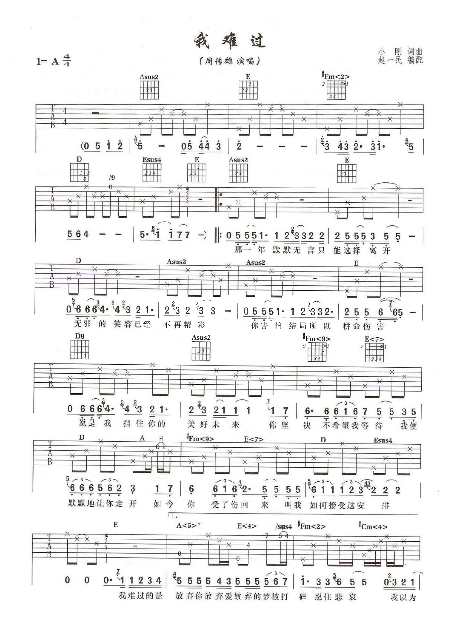 曲谱介绍: A调版周传雄《我难过》吉他弹唱六线谱