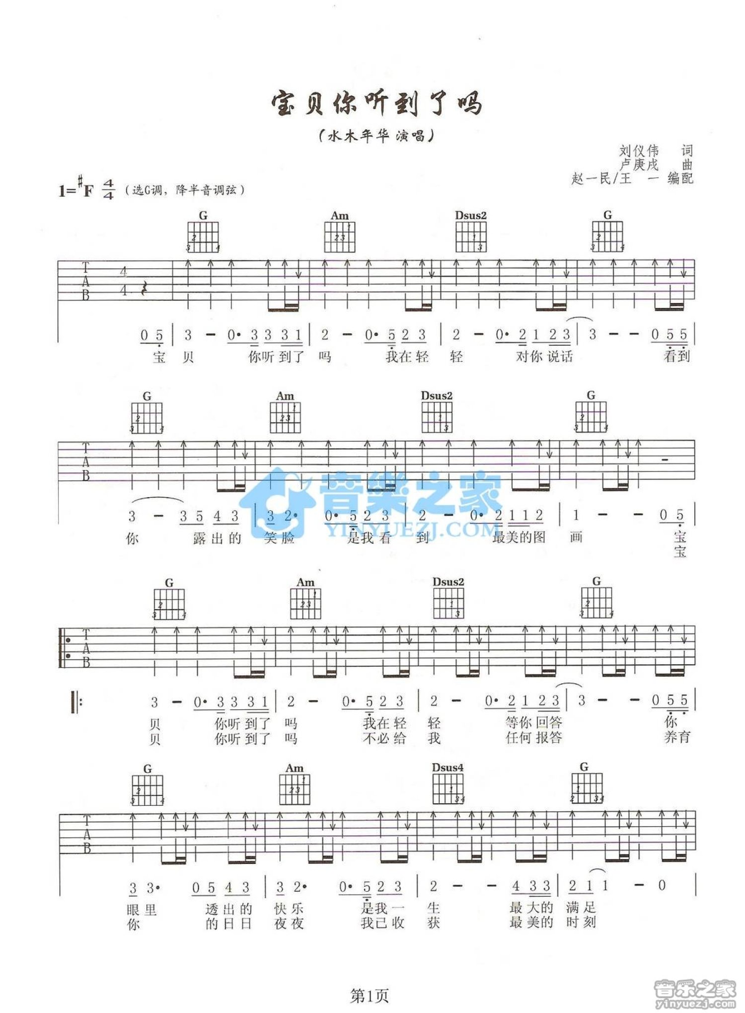 曲谱介绍: G调版水木年华《宝贝你听到了吗》吉他弹唱六线谱