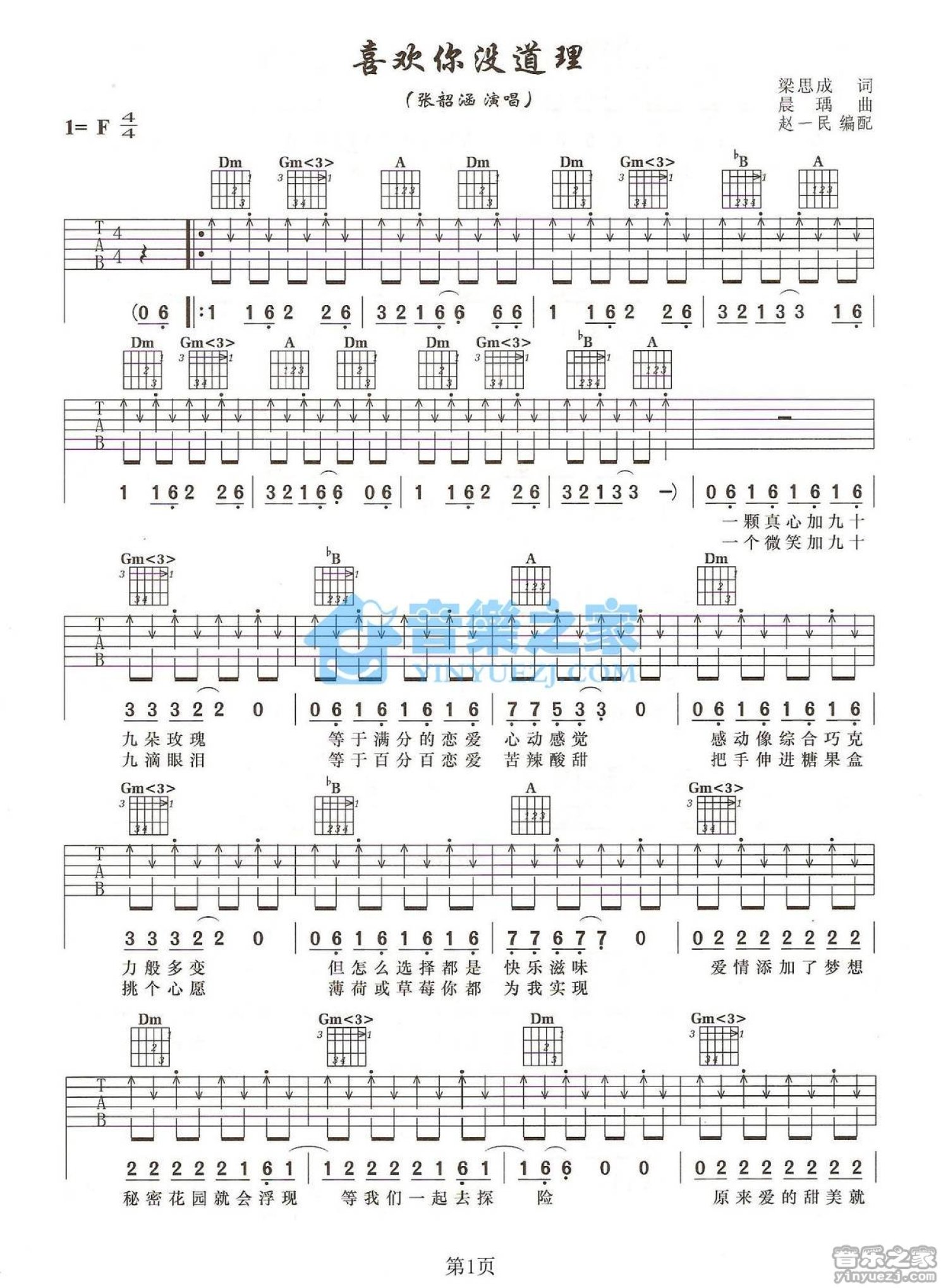 曲谱介绍: F调版张韶涵《喜欢你没道理》吉他弹唱六线谱