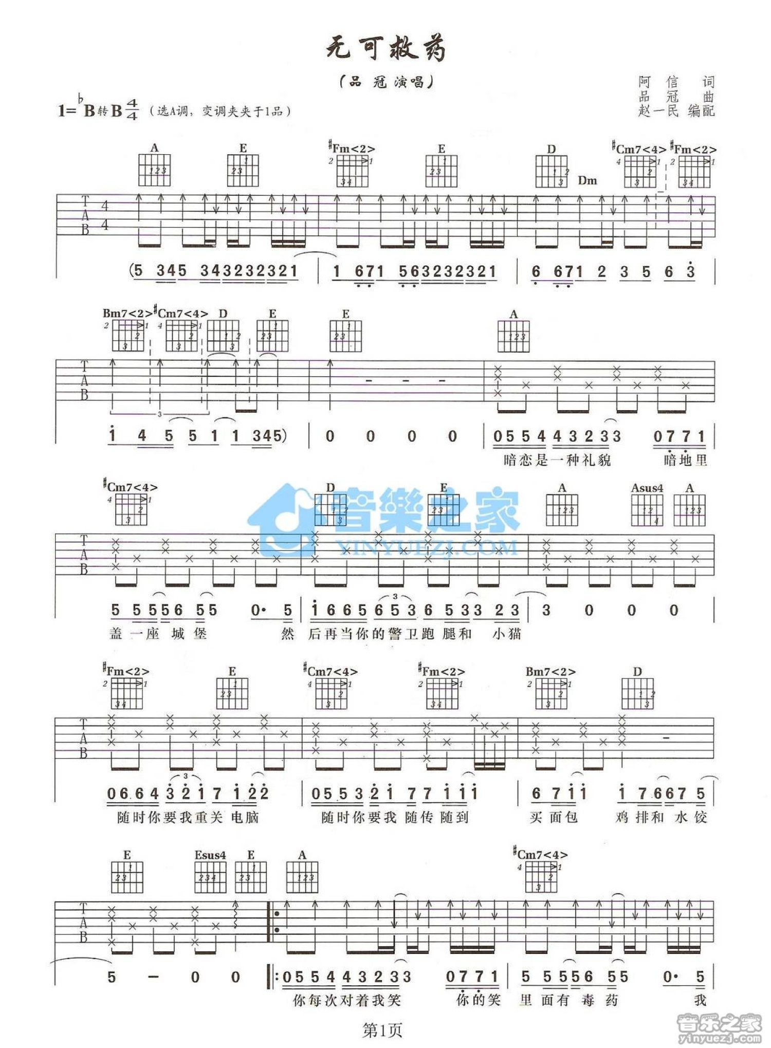 曲谱介绍: A调版品冠《无可救药》吉他弹唱六线谱