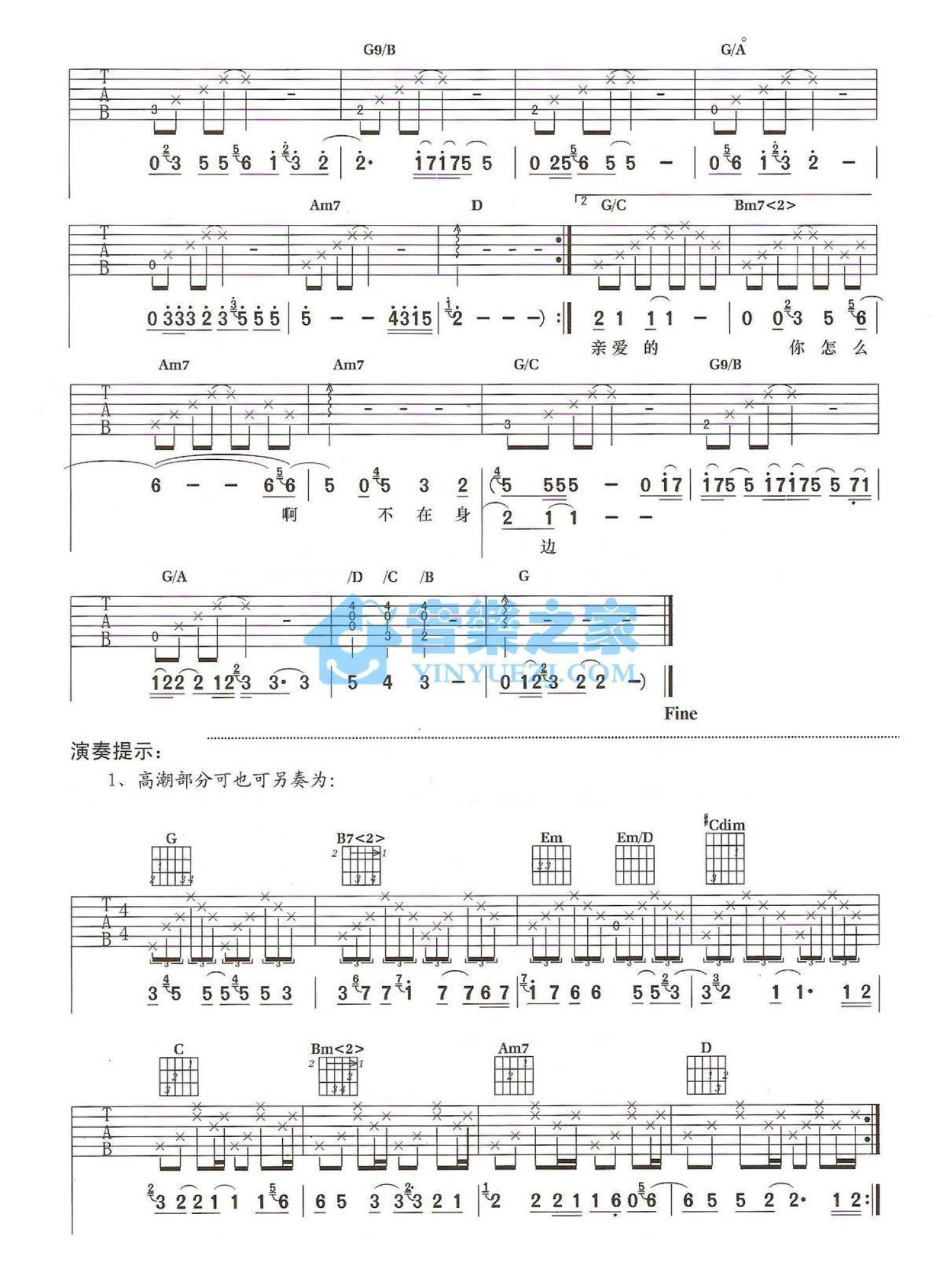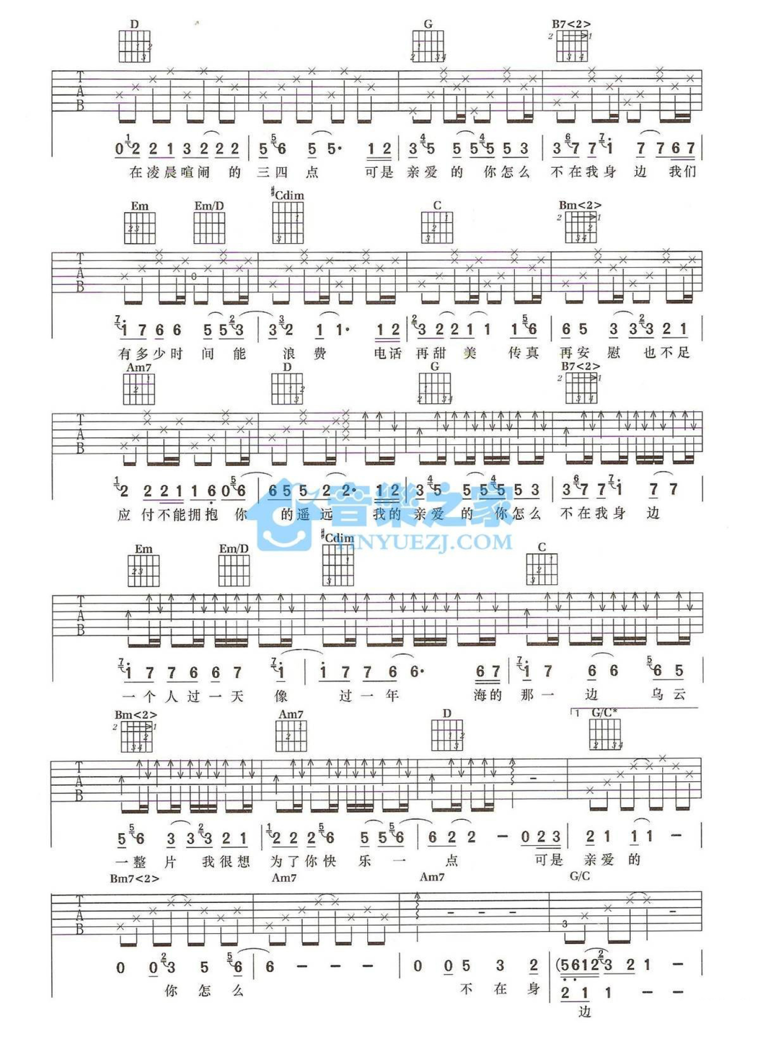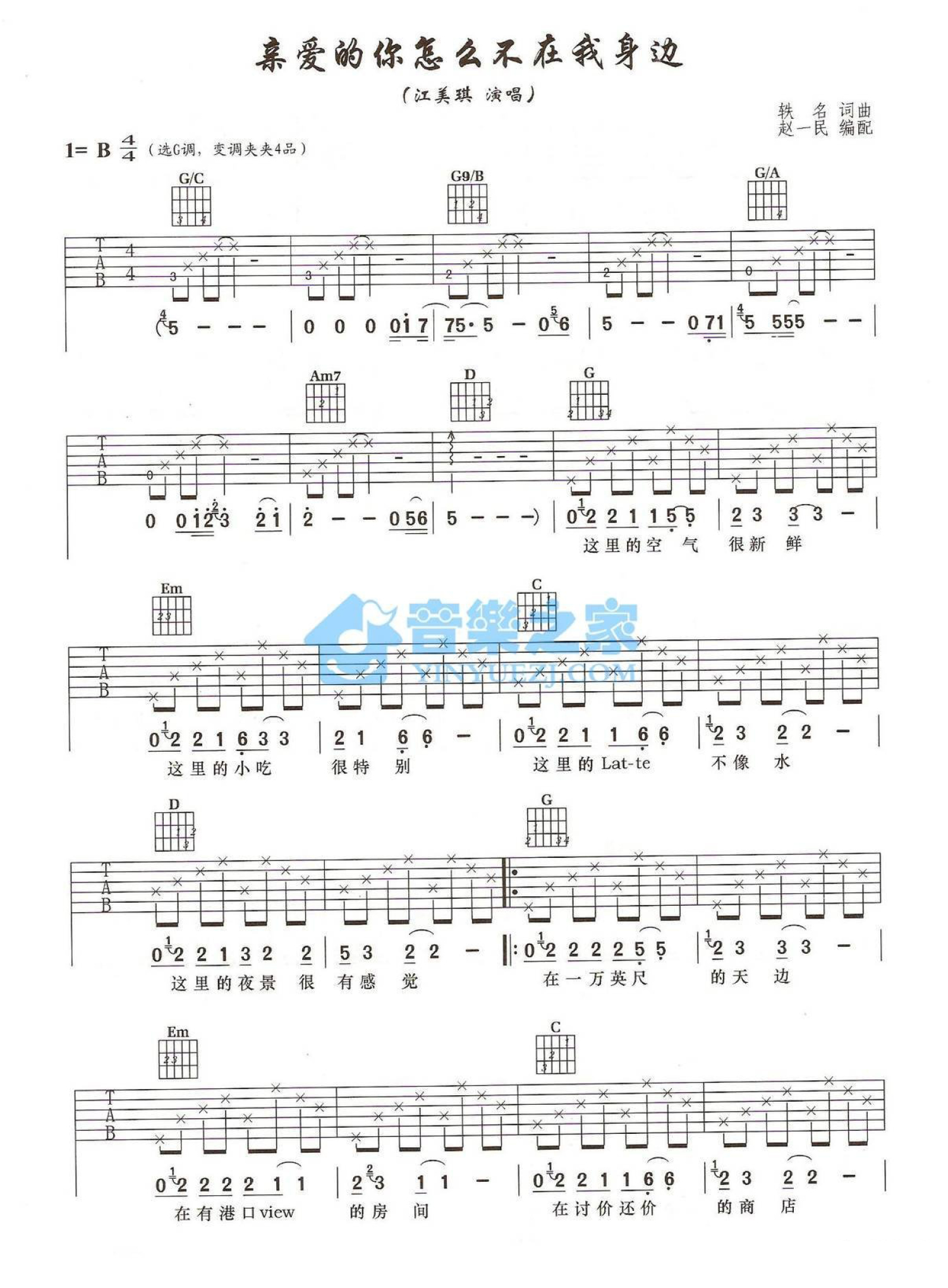 曲谱介绍: G调版《亲爱的你怎么不在我身边》吉他弹唱六线谱