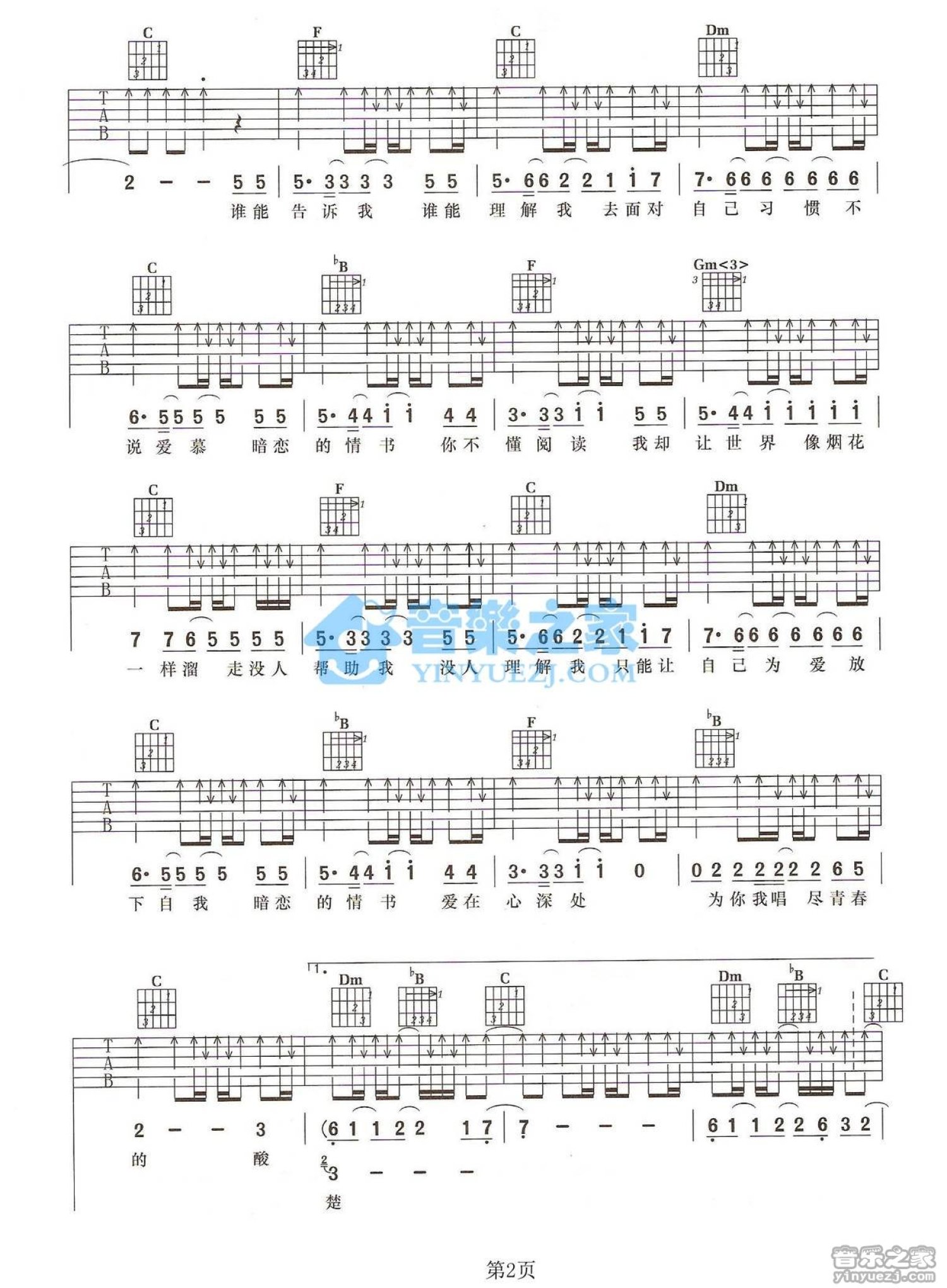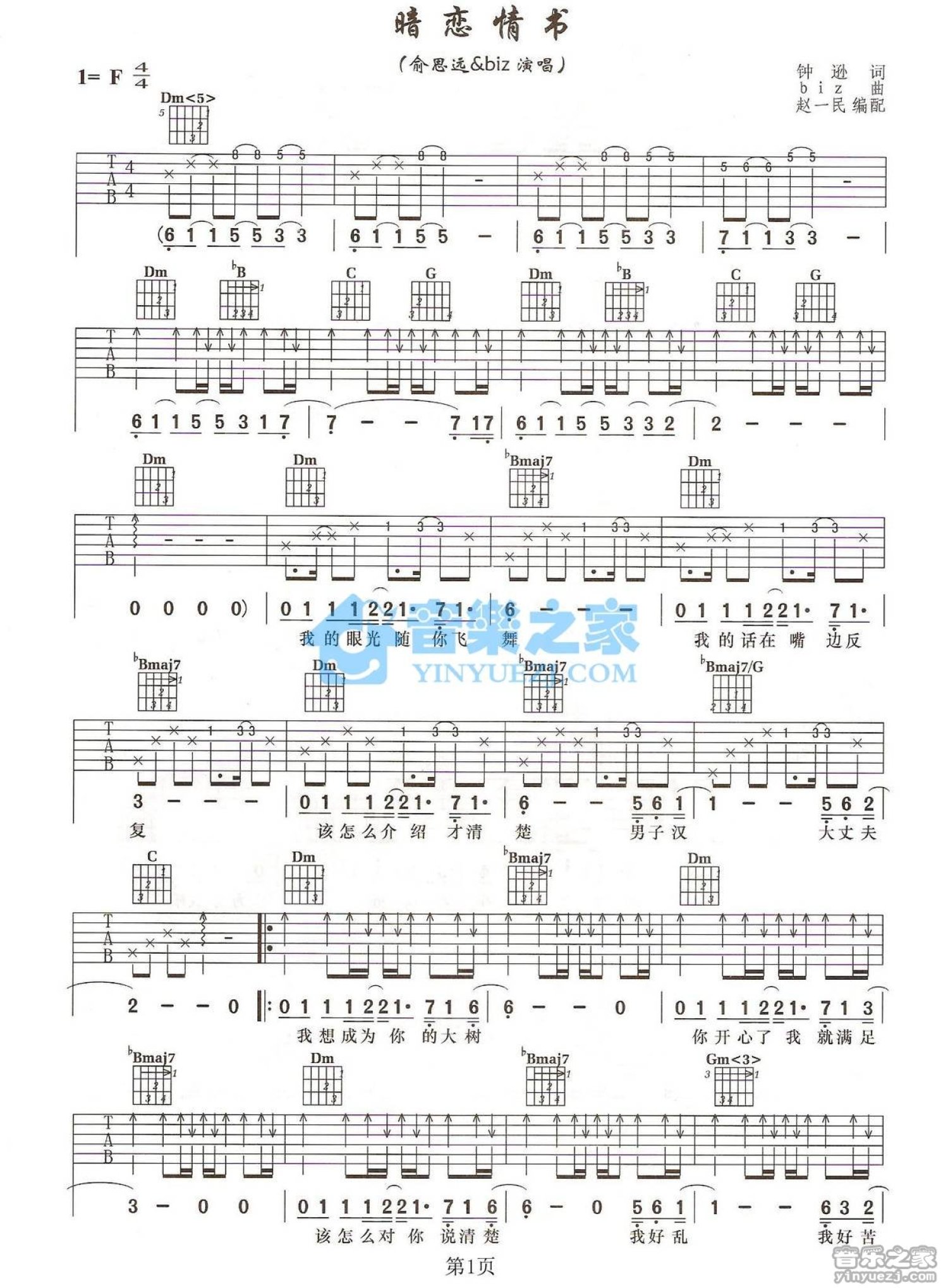 曲谱介绍: F调版俞思远/Biz《暗恋情书》吉他弹唱六线谱