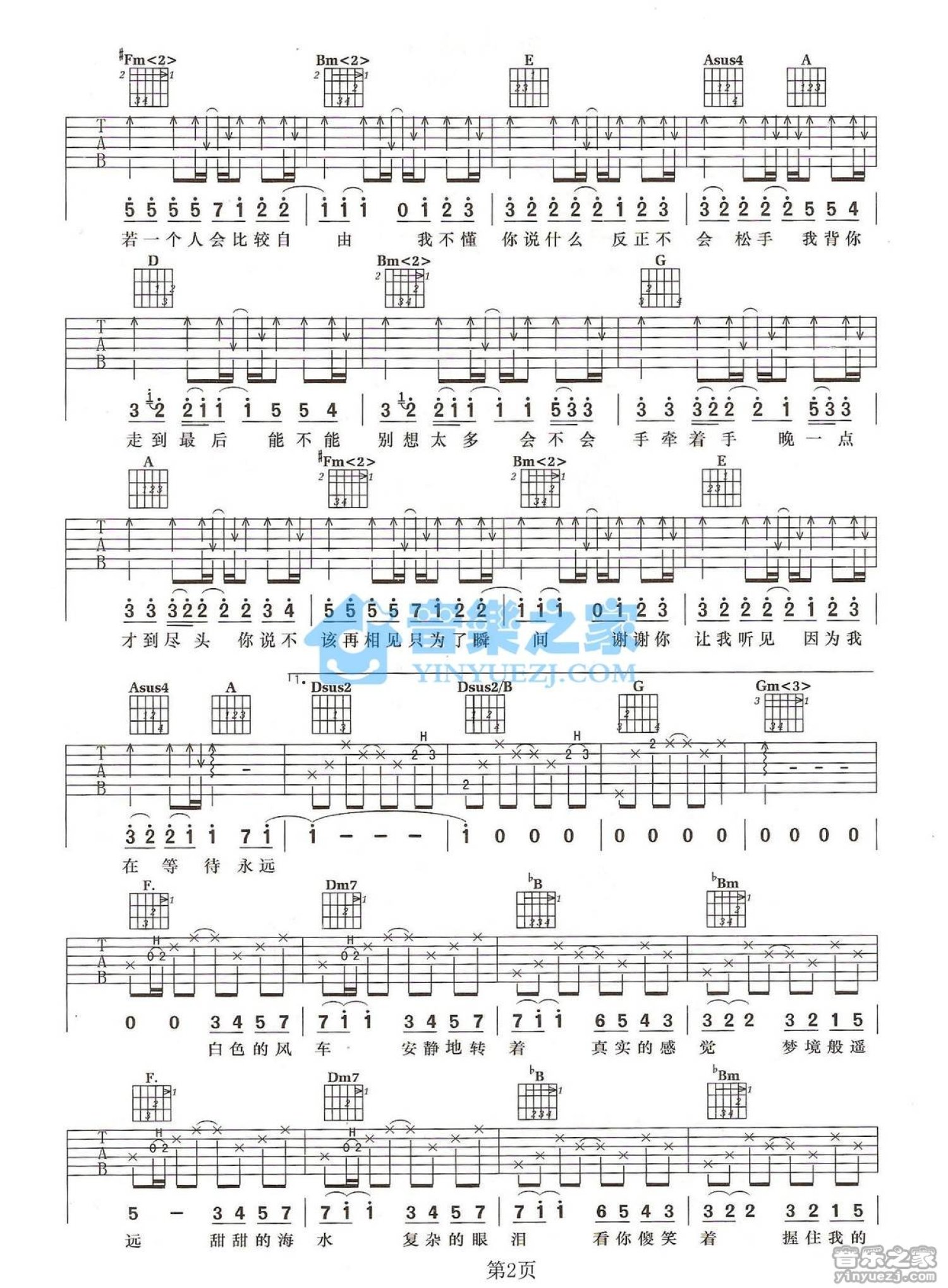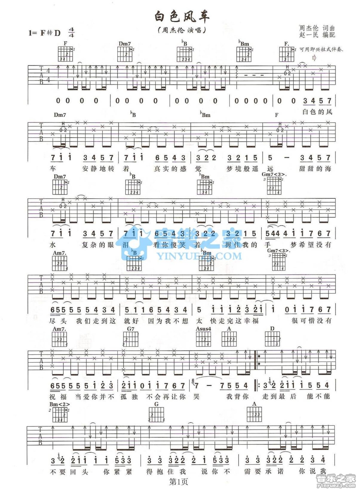曲谱介绍: F转D调版《白色风车》吉他弹唱六线谱