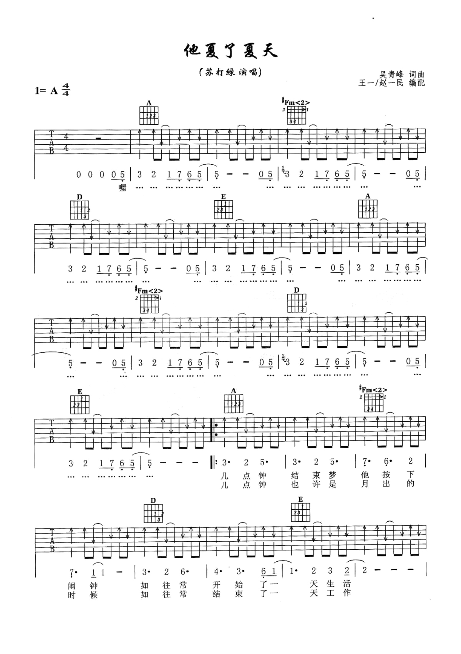曲谱介绍: A调版《他夏了夏天》吉他弹唱六线谱