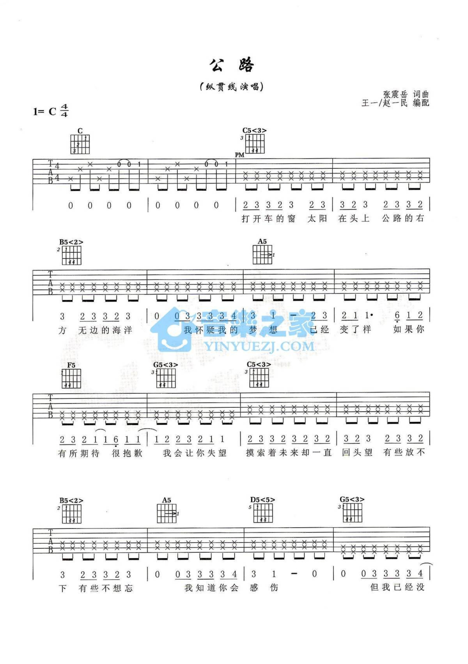 曲谱介绍: C调版纵贯线《公路》吉他弹唱六线谱