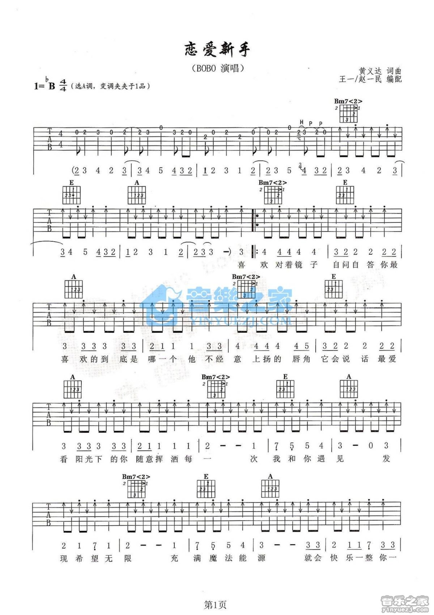 曲谱介绍: A调版 BOBO《恋爱新手》吉他弹唱六线谱