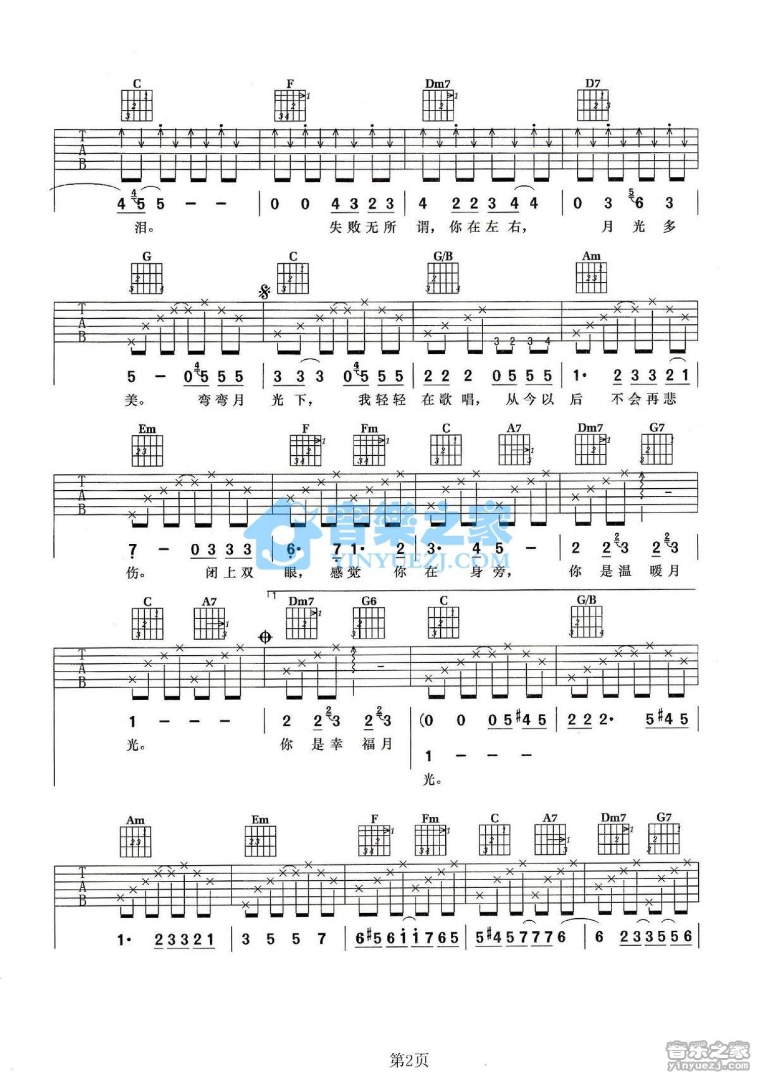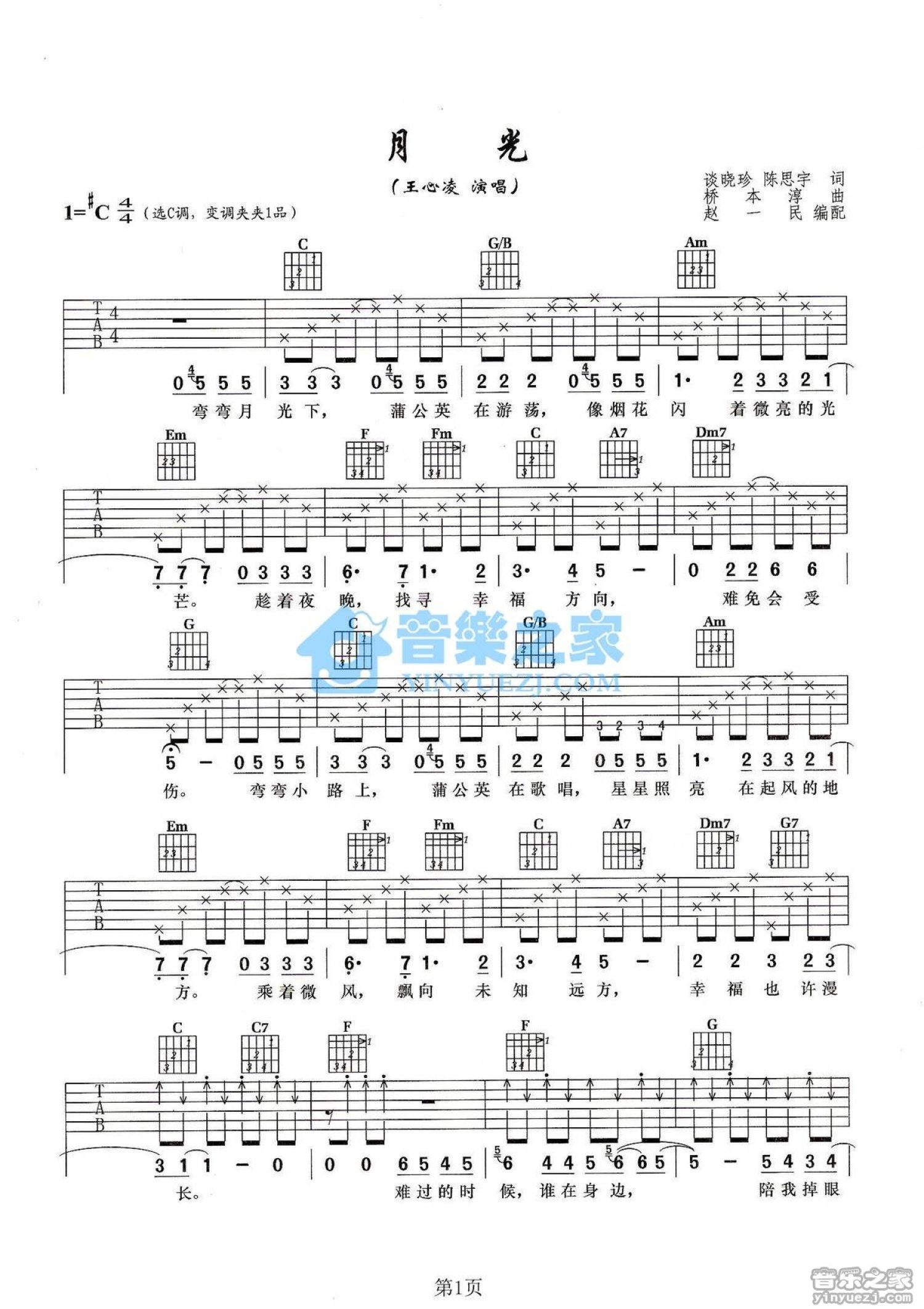 曲谱介绍: C调版王心凌《月光》吉他弹唱六线谱