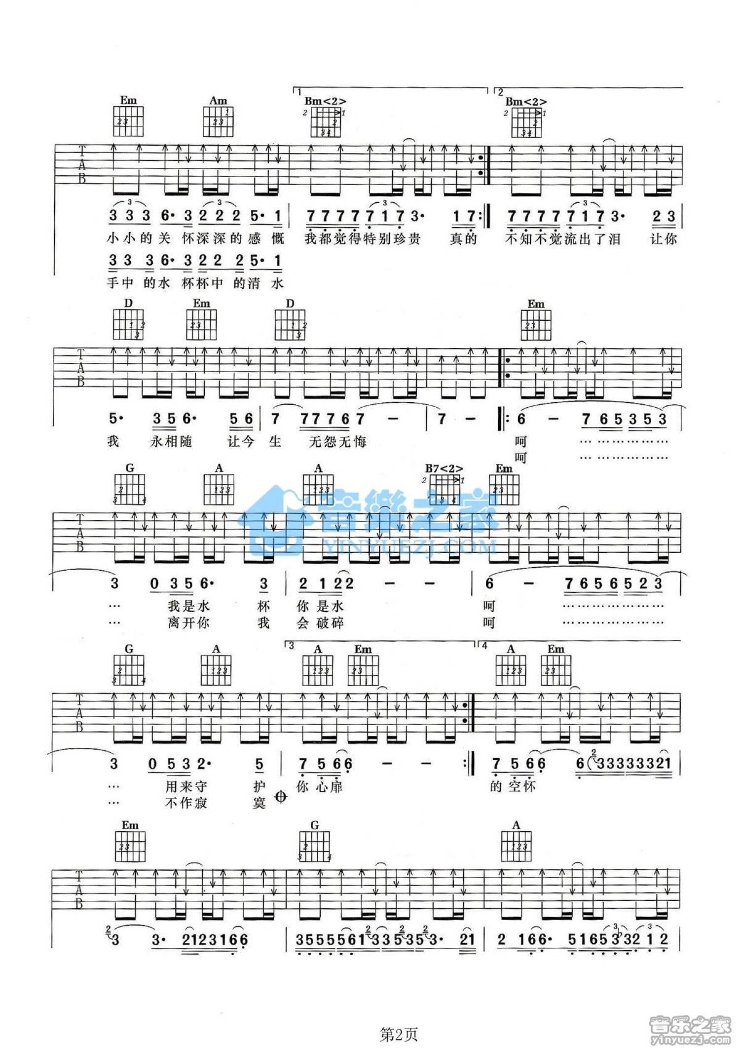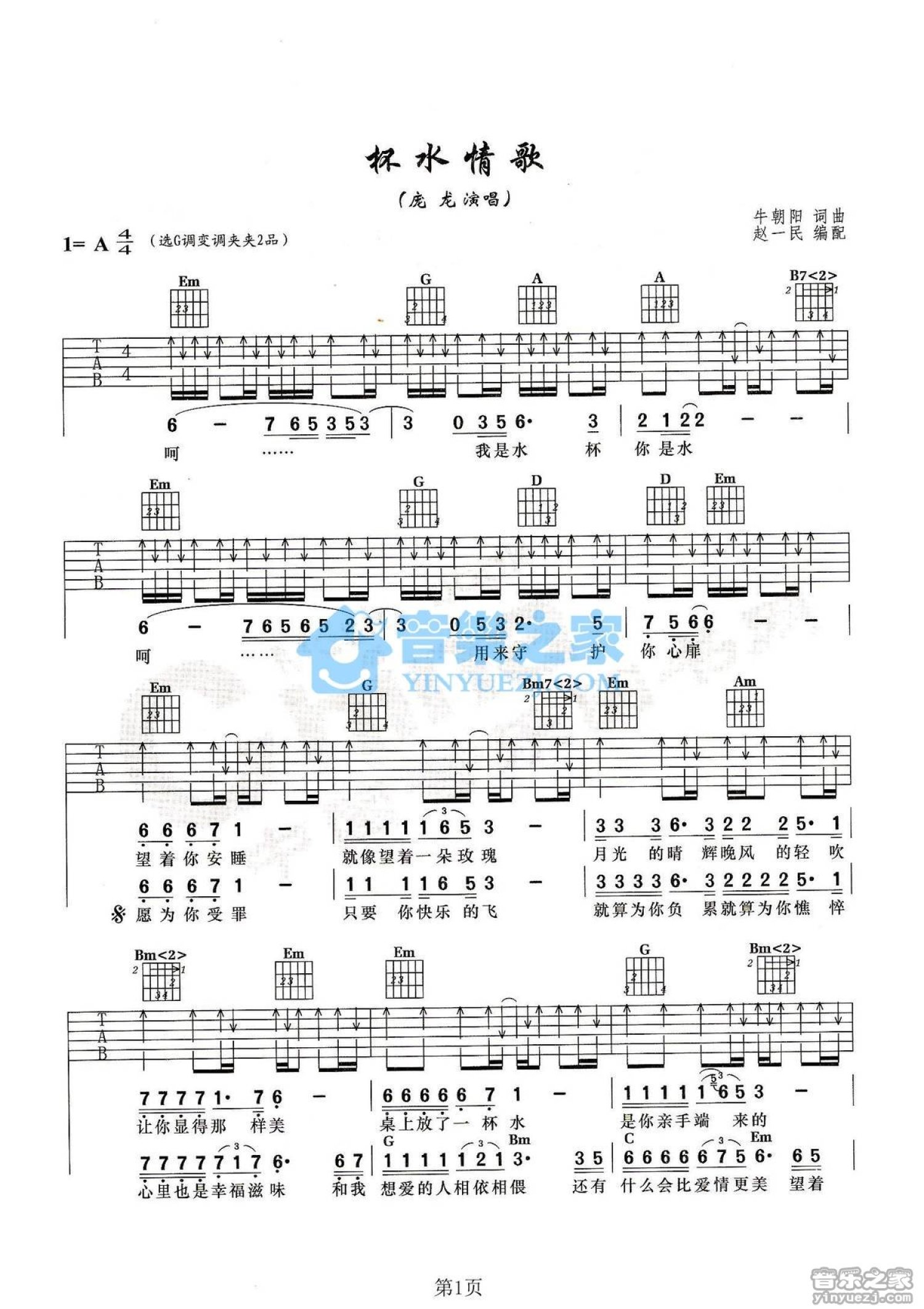 曲谱介绍: G调版庞龙《杯水情歌》吉他弹唱六线谱