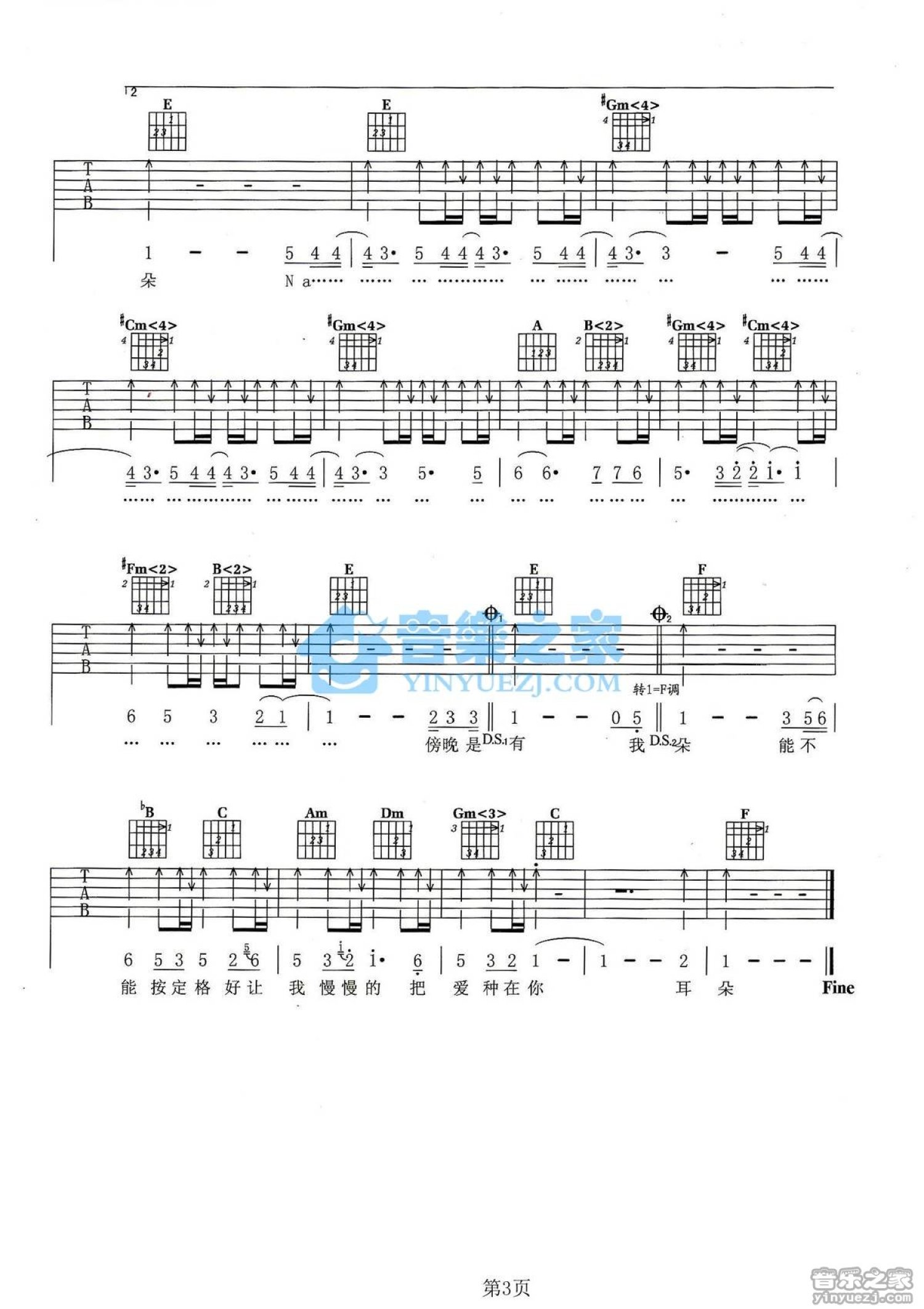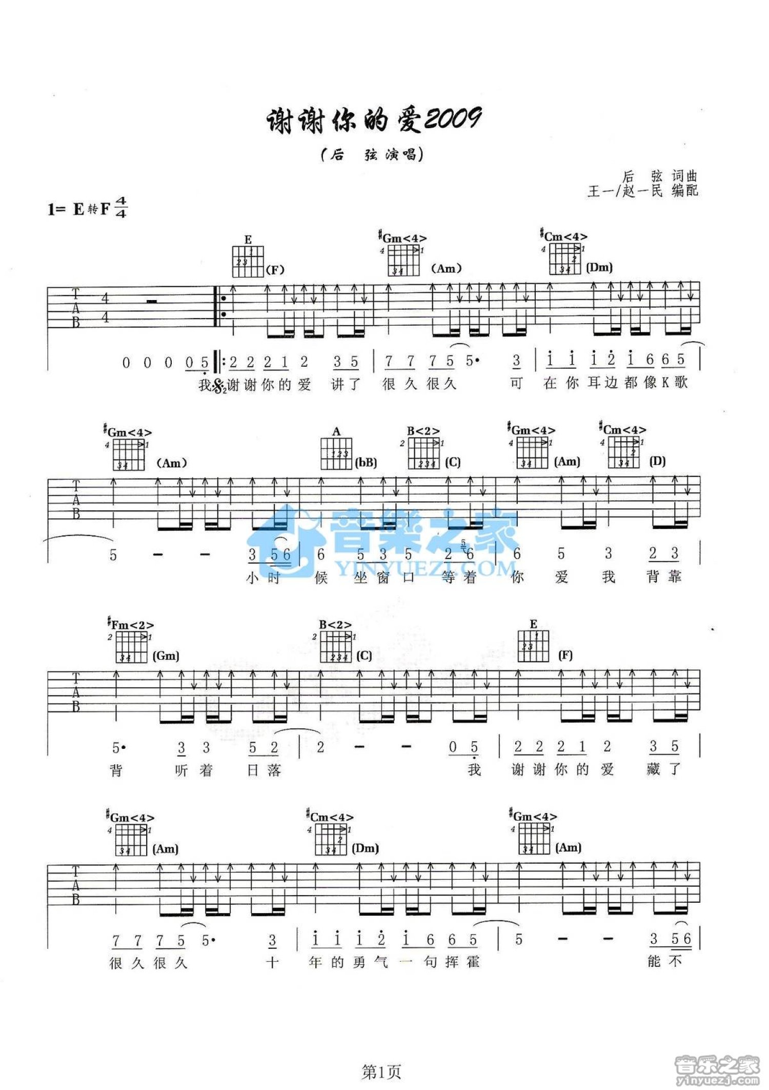 曲谱介绍: E转F调版《谢谢你的爱2009》吉他弹唱六线谱