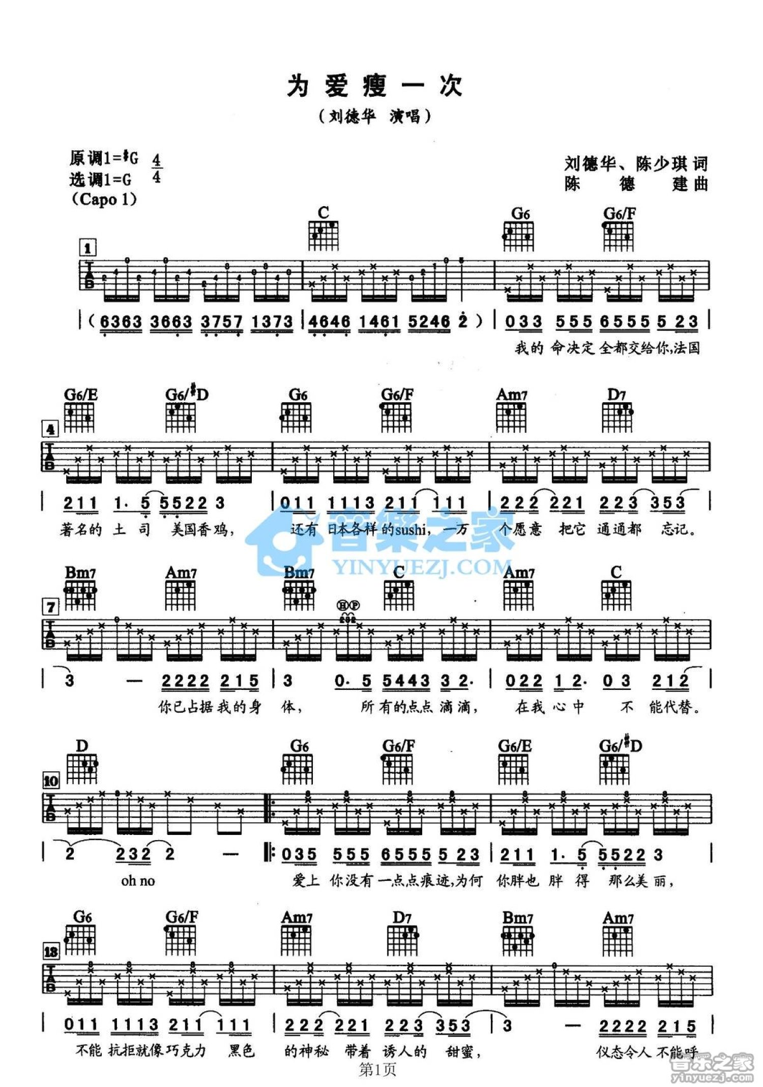 曲谱介绍: G调版刘德华《为爱瘦一次》吉他弹唱六线谱