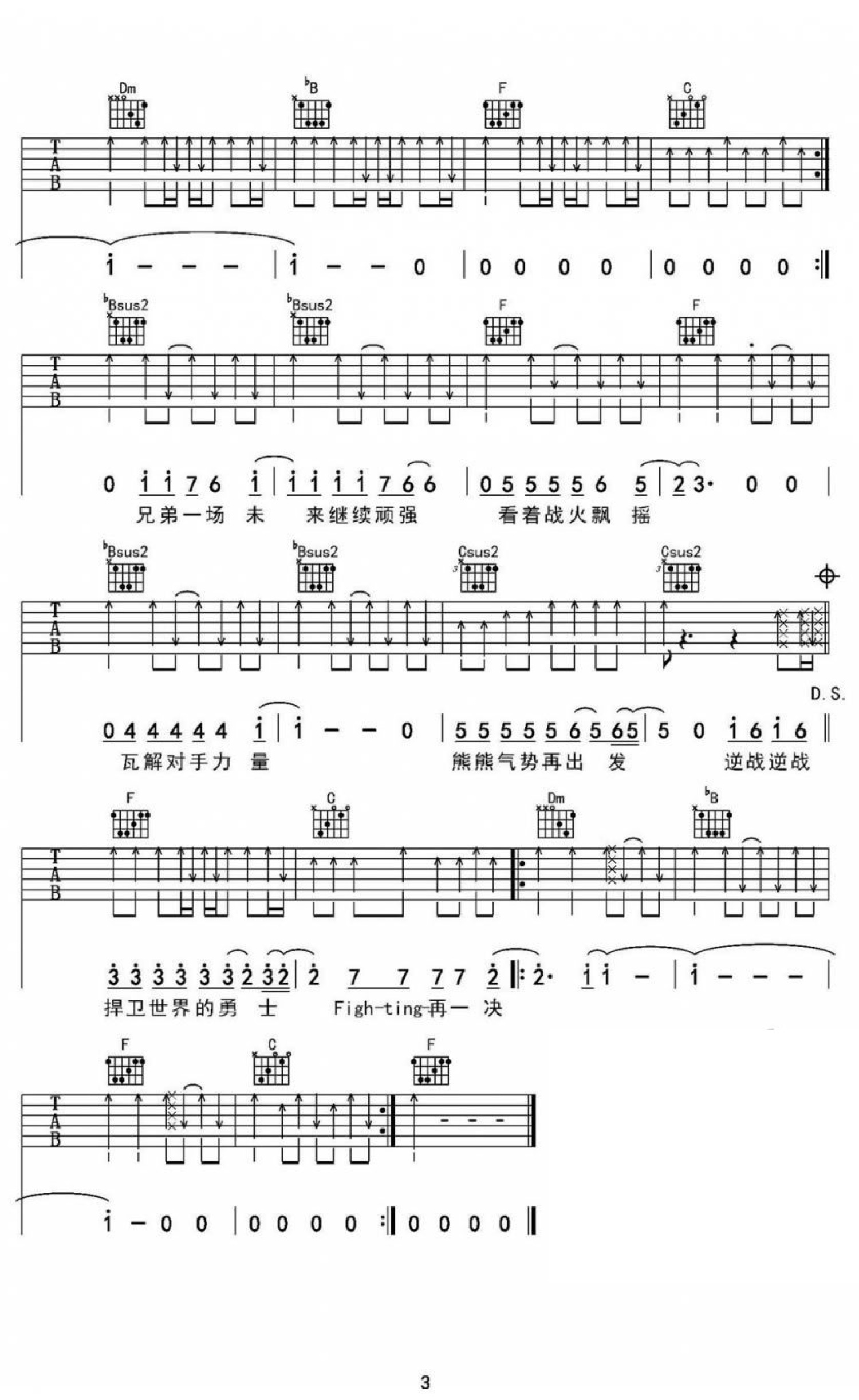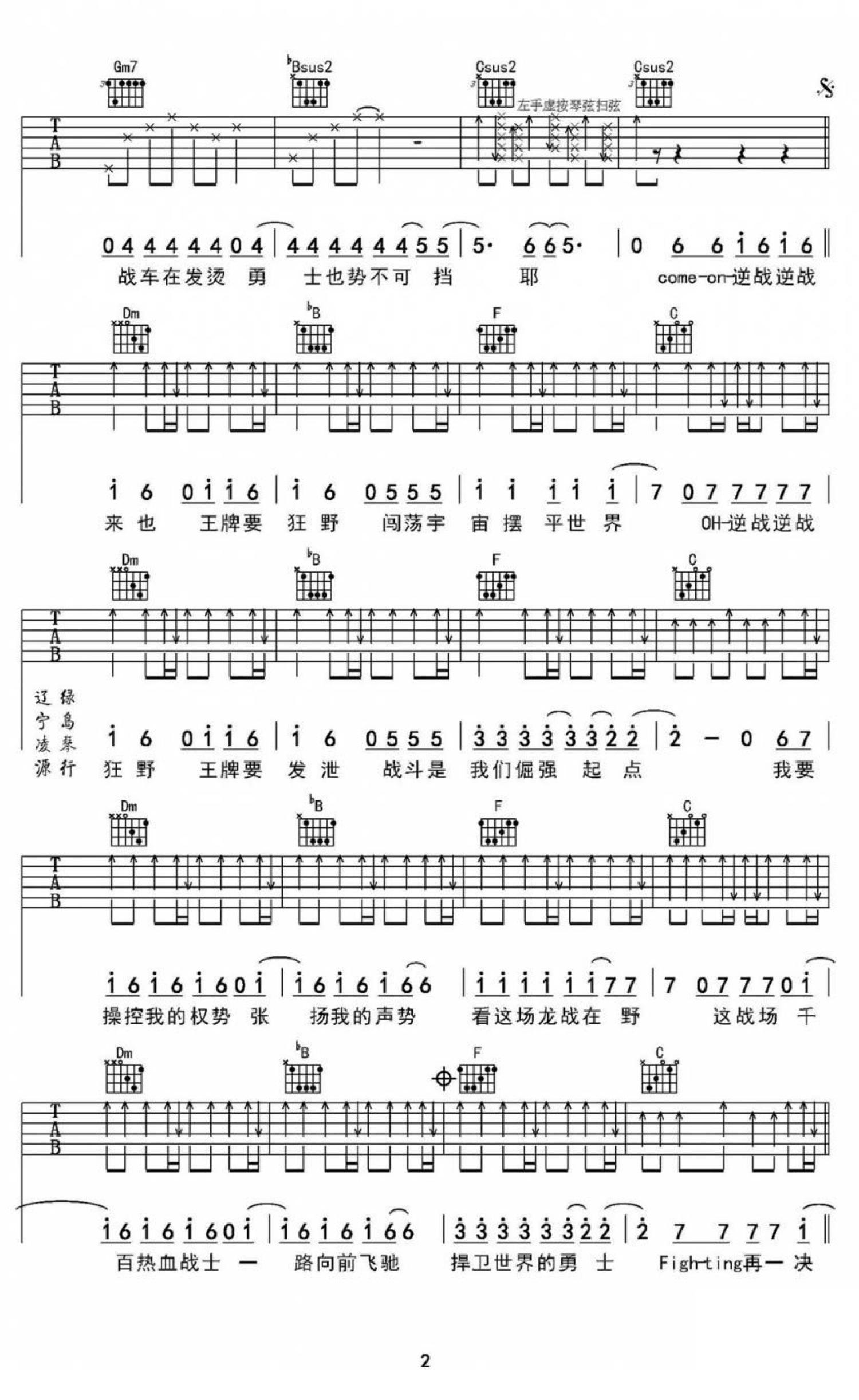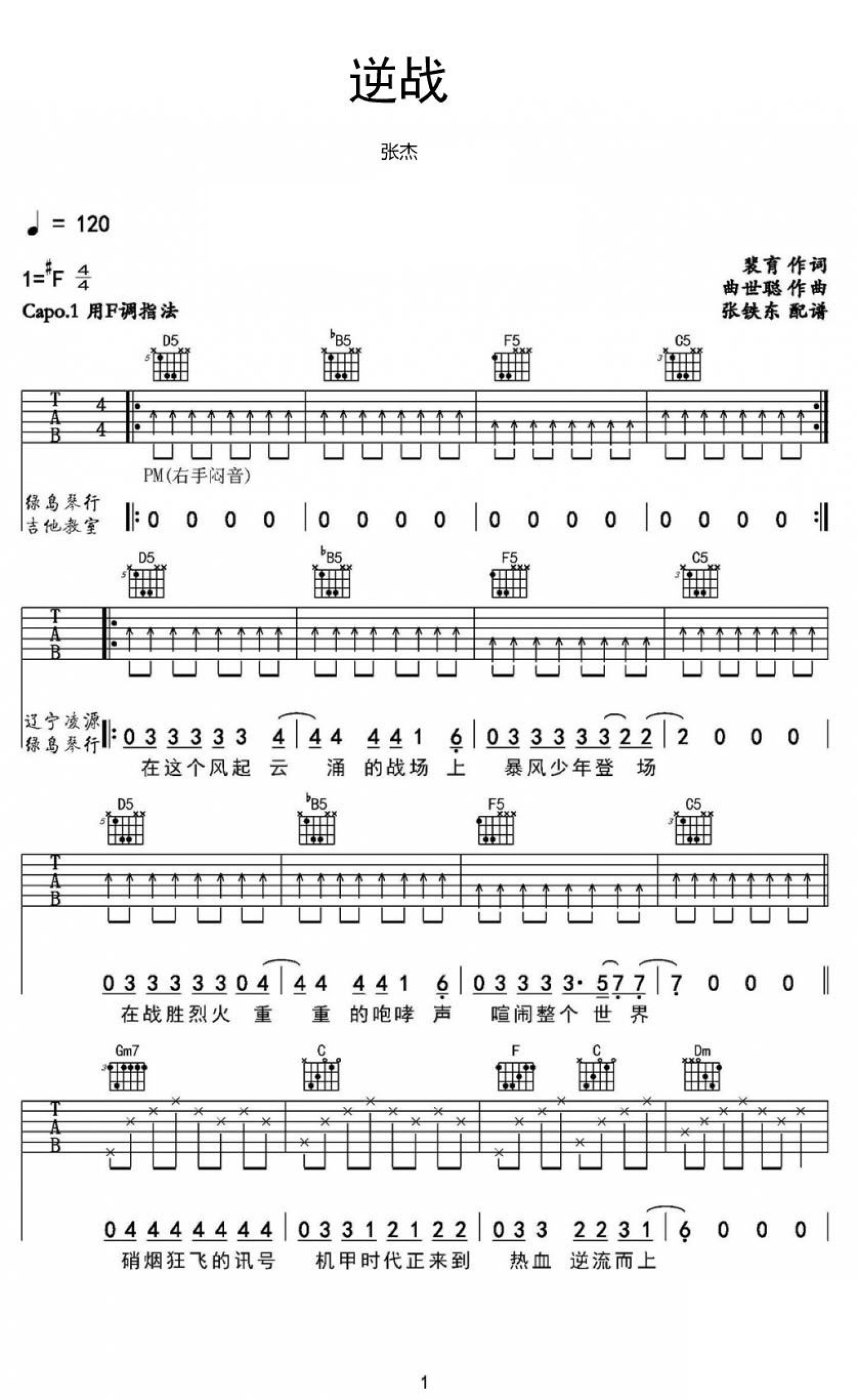 曲谱介绍: 张杰逆战吉他谱,原调#F,Capo一品,用F调指法。《逆战》是张杰作为某枪战网游代言人演唱的游戏主题曲,快节奏的旋律,带有金属感的音色,爆发力十足。动感的音乐、热血的歌词让人听后顿感热血沸腾,仿佛亲临最真实的游戏世界。