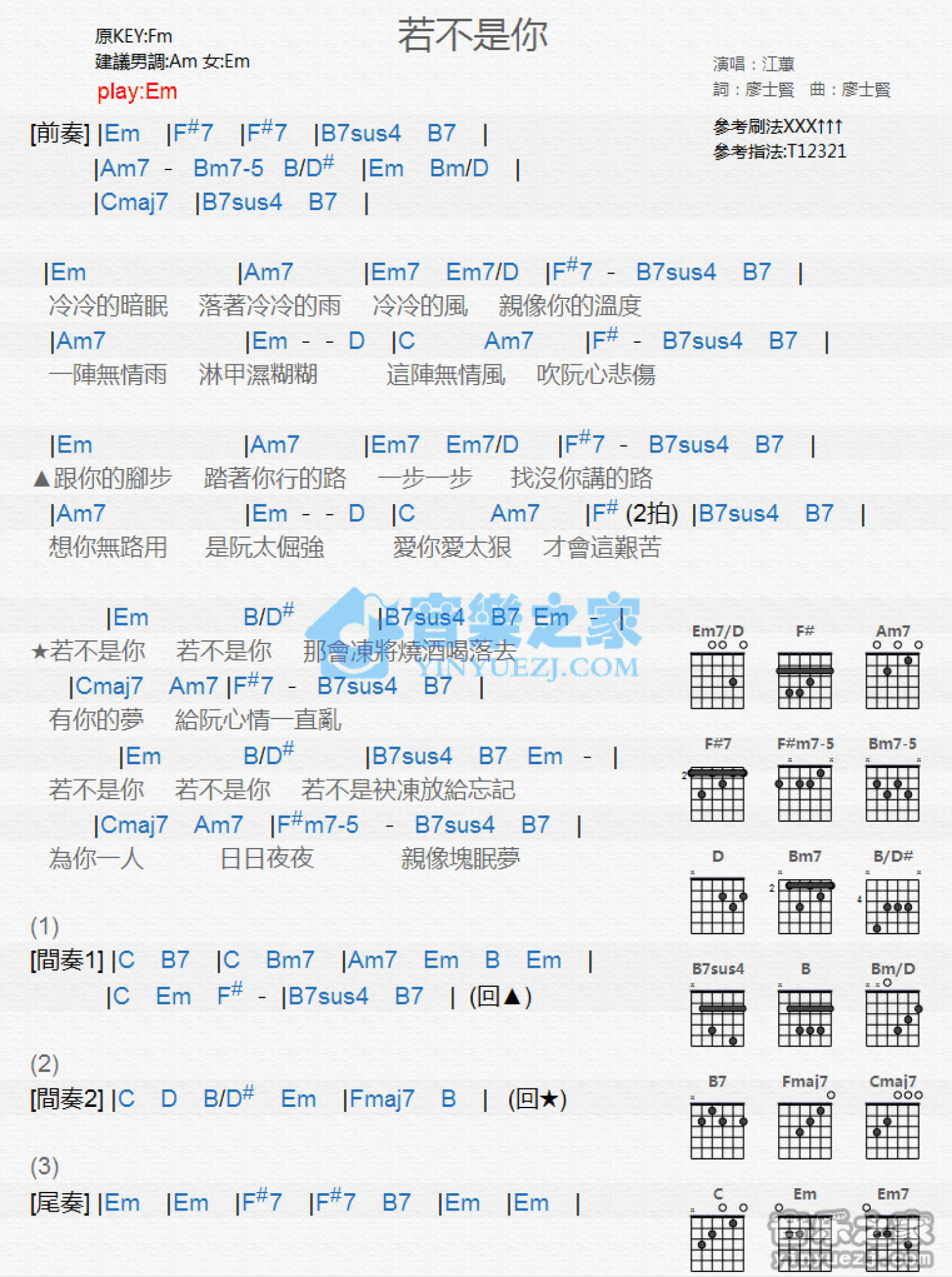 曲谱介绍: Em调版江蕙《若不是你》吉他和弦弹唱谱