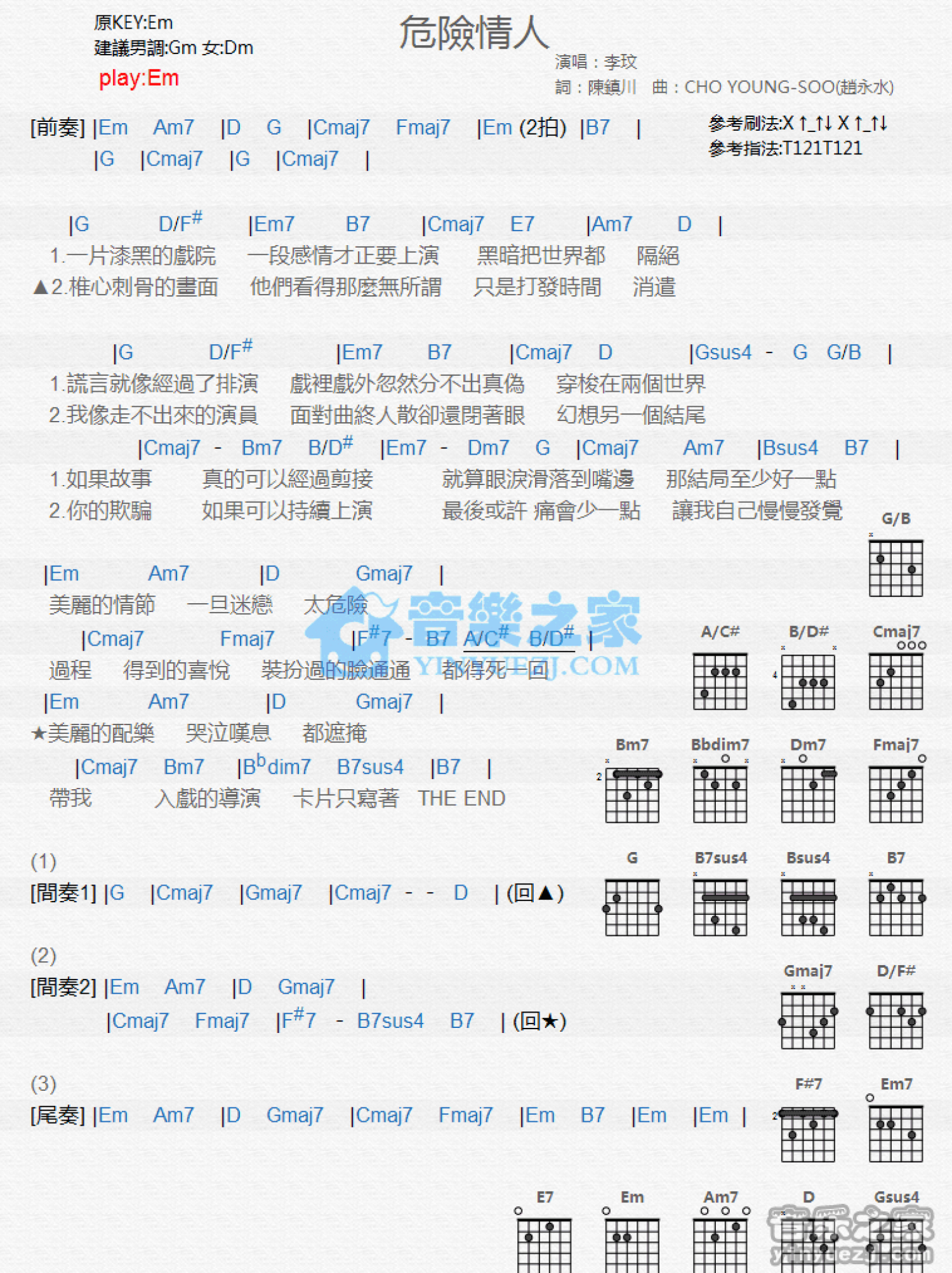 曲谱介绍: Em调版李玟《危险情人》吉他和弦弹唱谱
