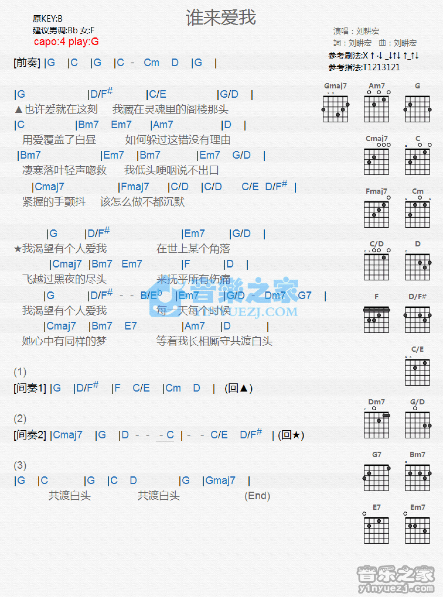 曲谱介绍: G调版刘耕宏《谁来爱我》吉他和弦弹唱谱