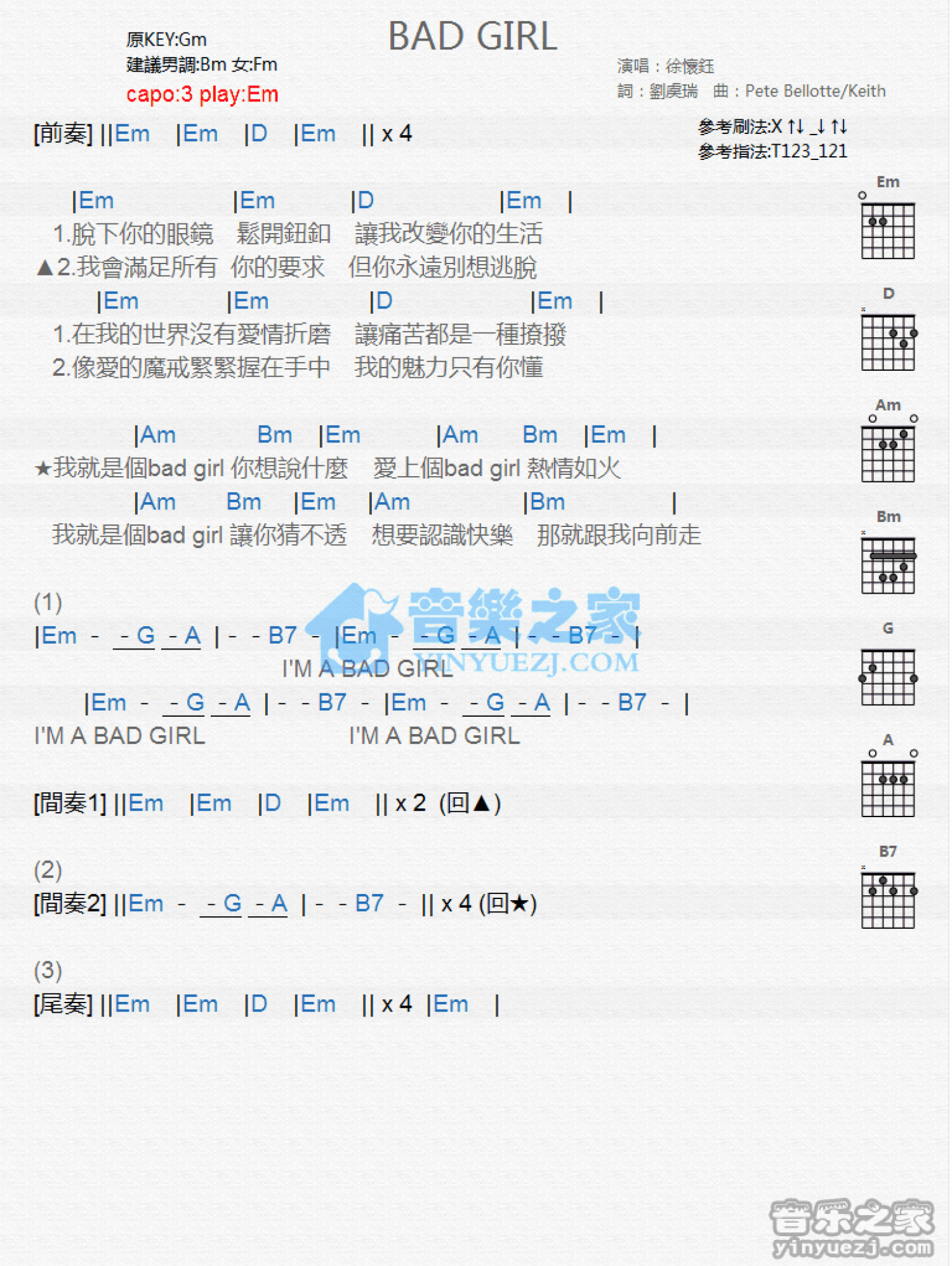 曲谱介绍: Em调版徐怀钰《BadGirl》吉他和弦弹唱谱