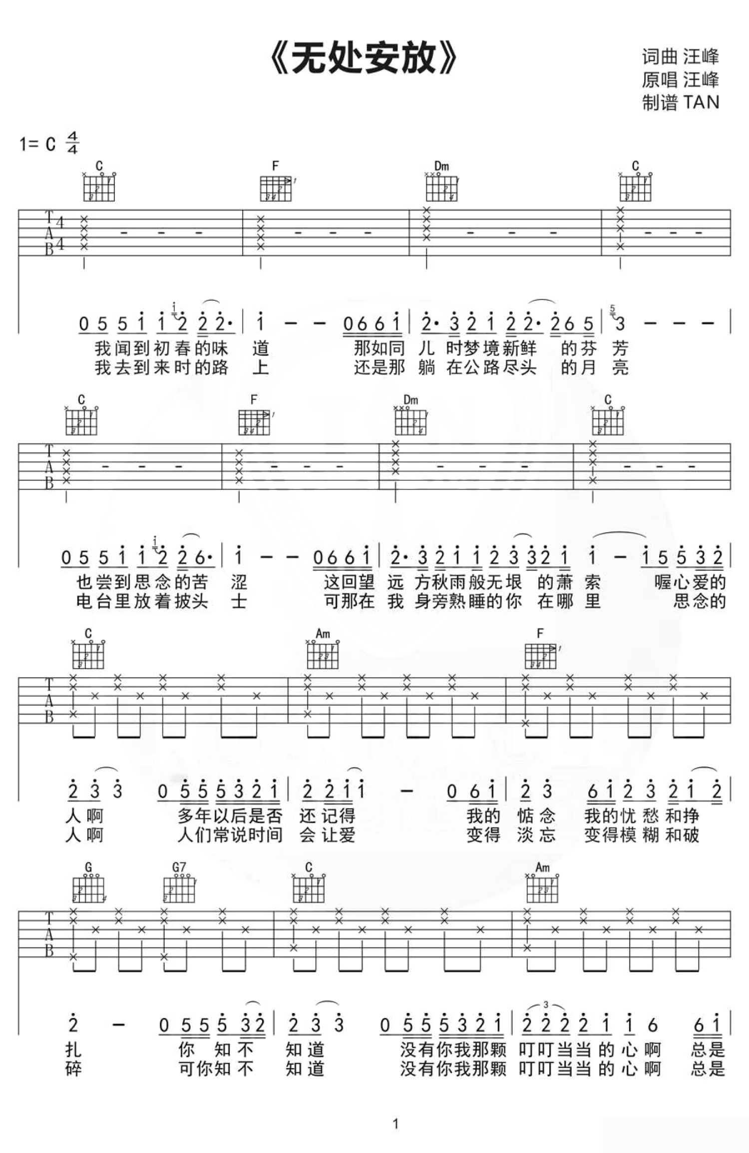 无处安放吉他谱 - 汪峰 - C调吉他弹唱谱