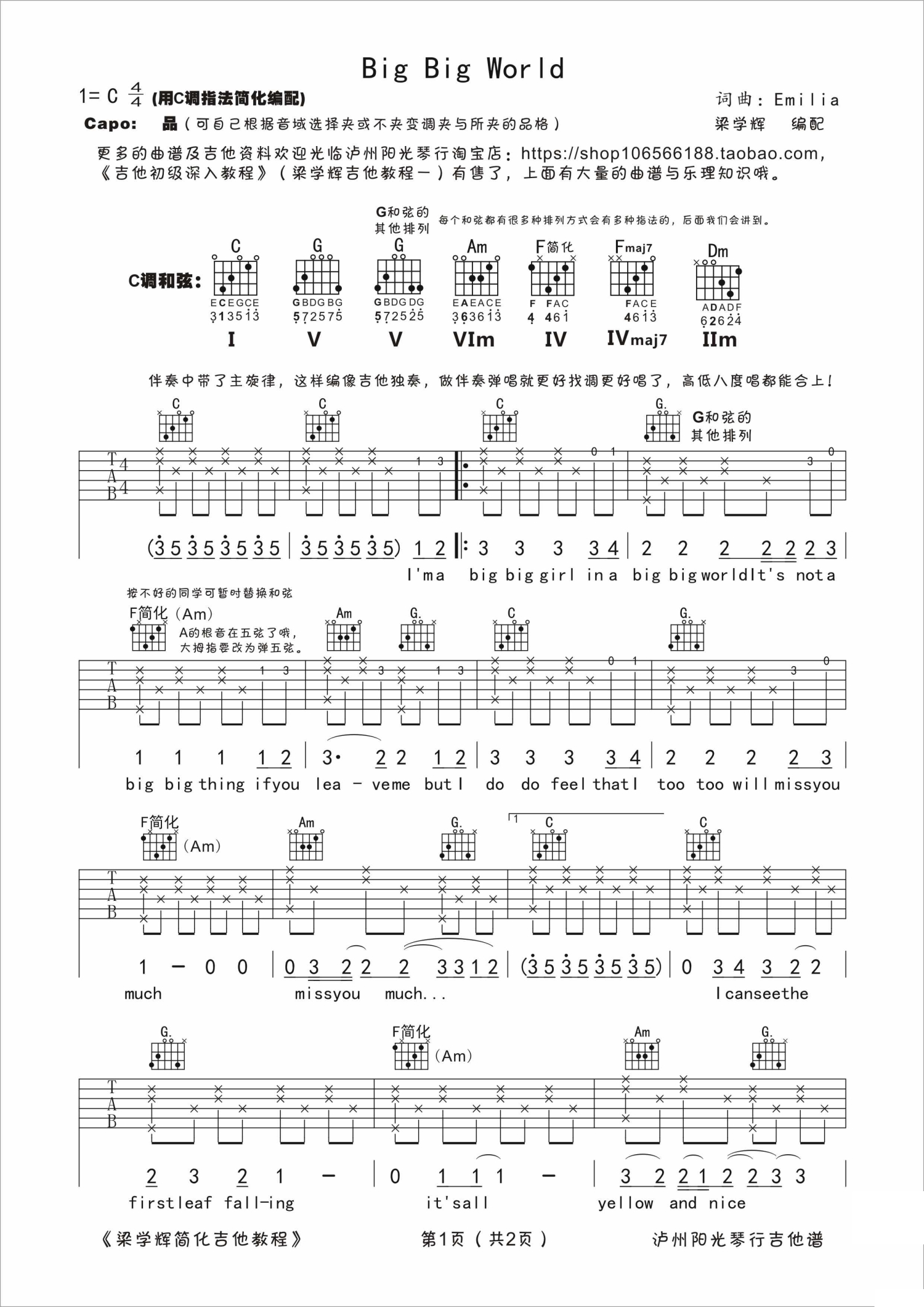 Big Big World吉他谱 - Emilia - C调吉他弹唱谱